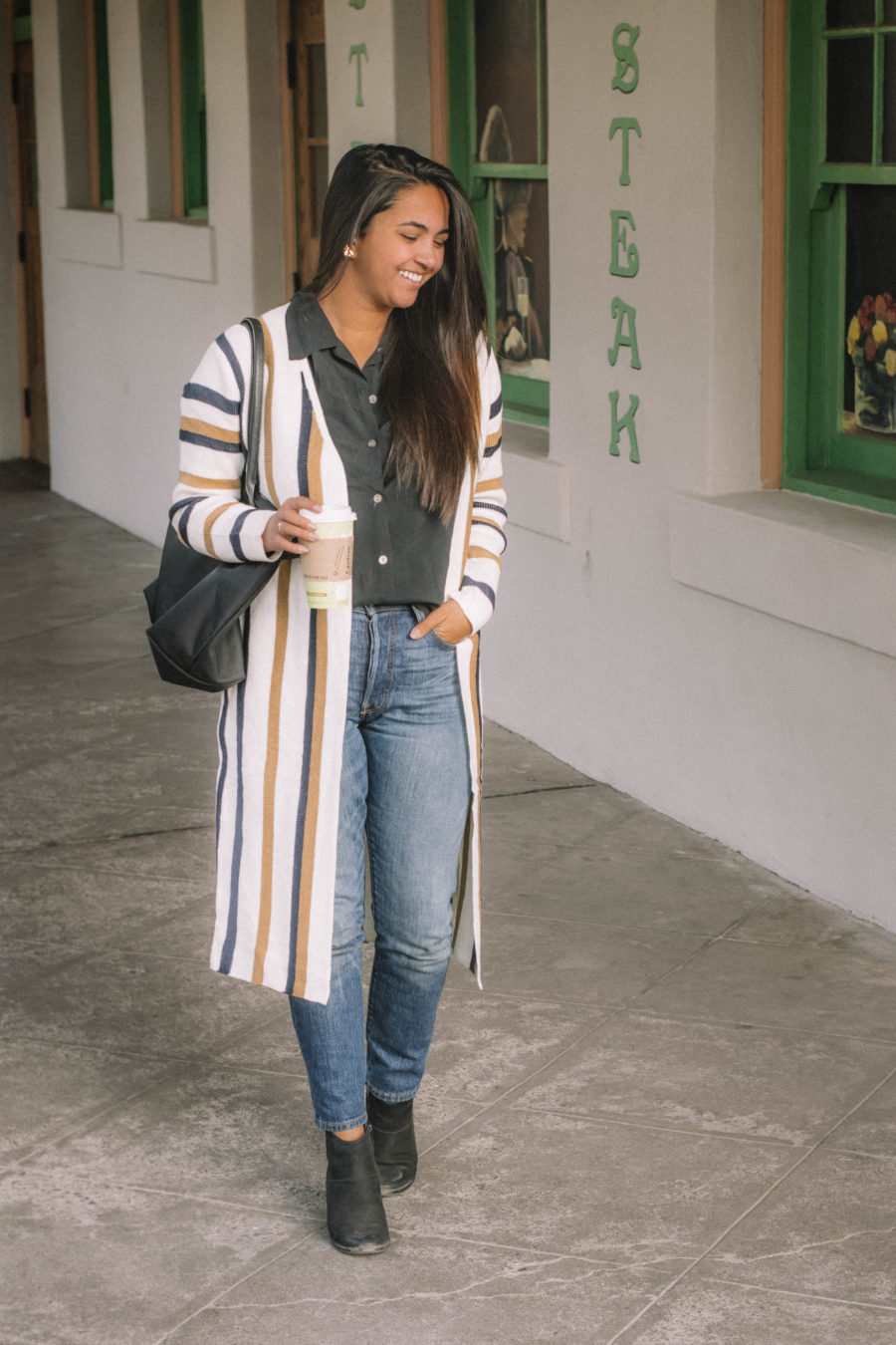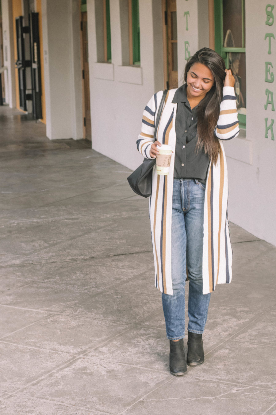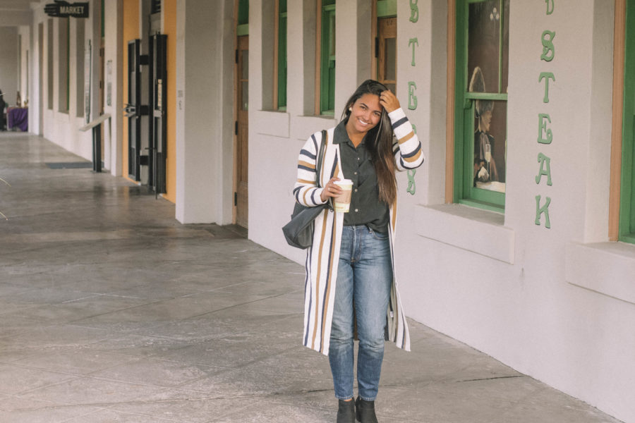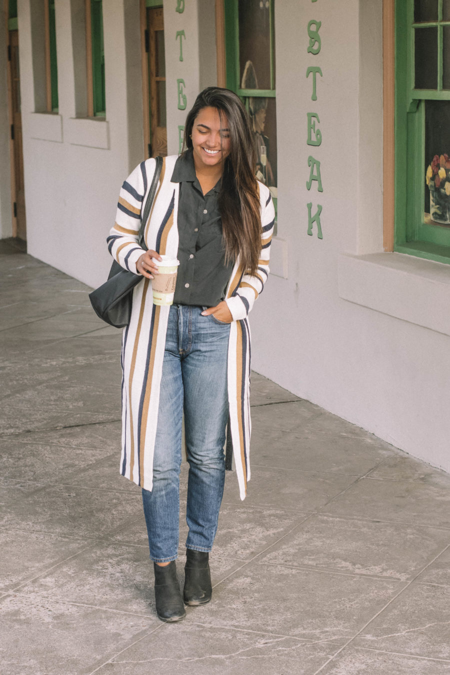 Simple outfits with statement jewelry is my MO. Seriously, when it comes to going out for brunch, drinks, or even date night, I like to change up my accessories to change up my entire look. While this outfit was on repeat during finals week, I’ve been swapping up the cardigans too so no one would know that I’ve just been wearing the same thing.