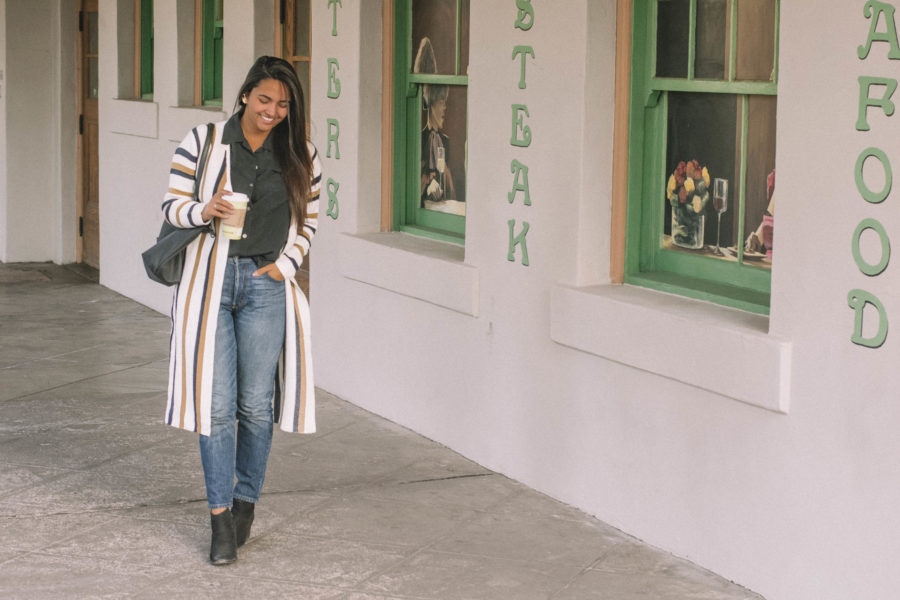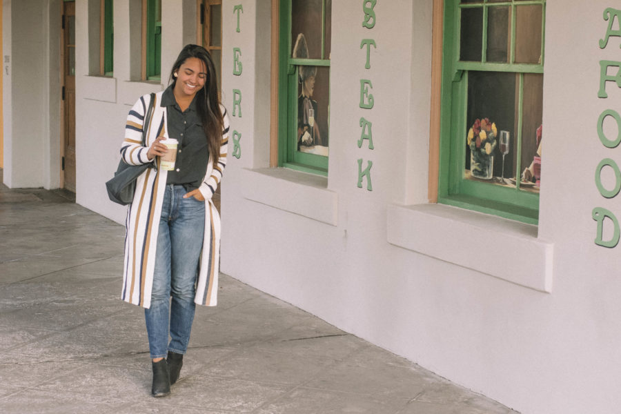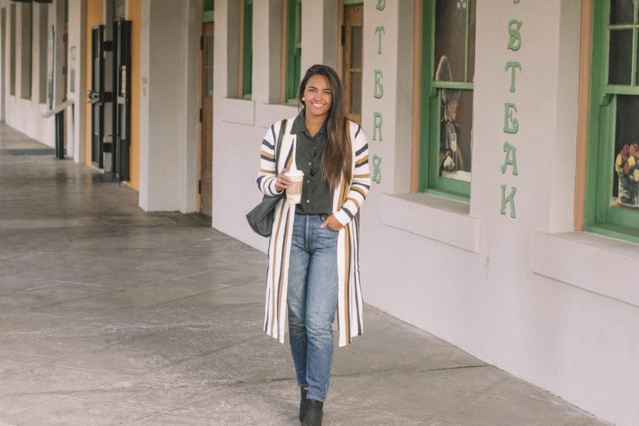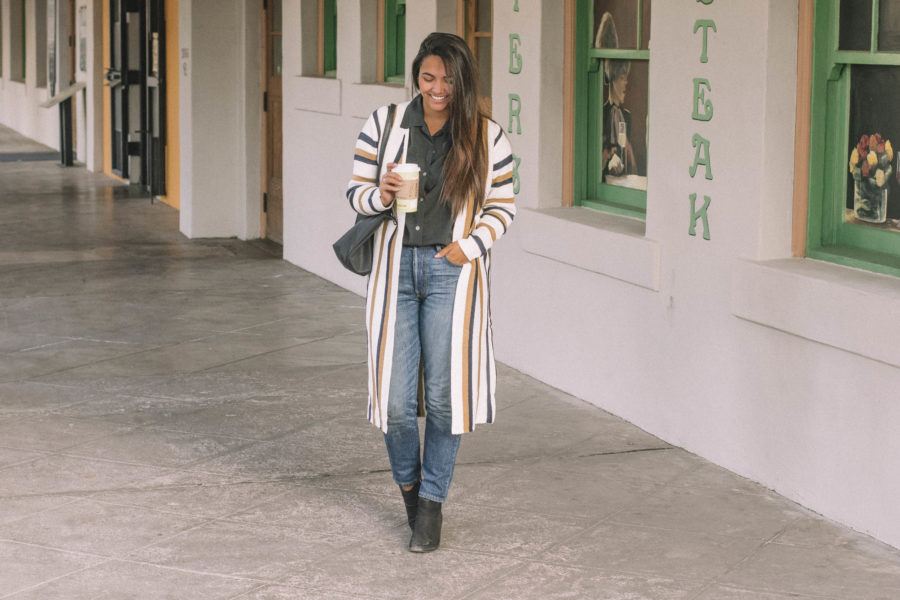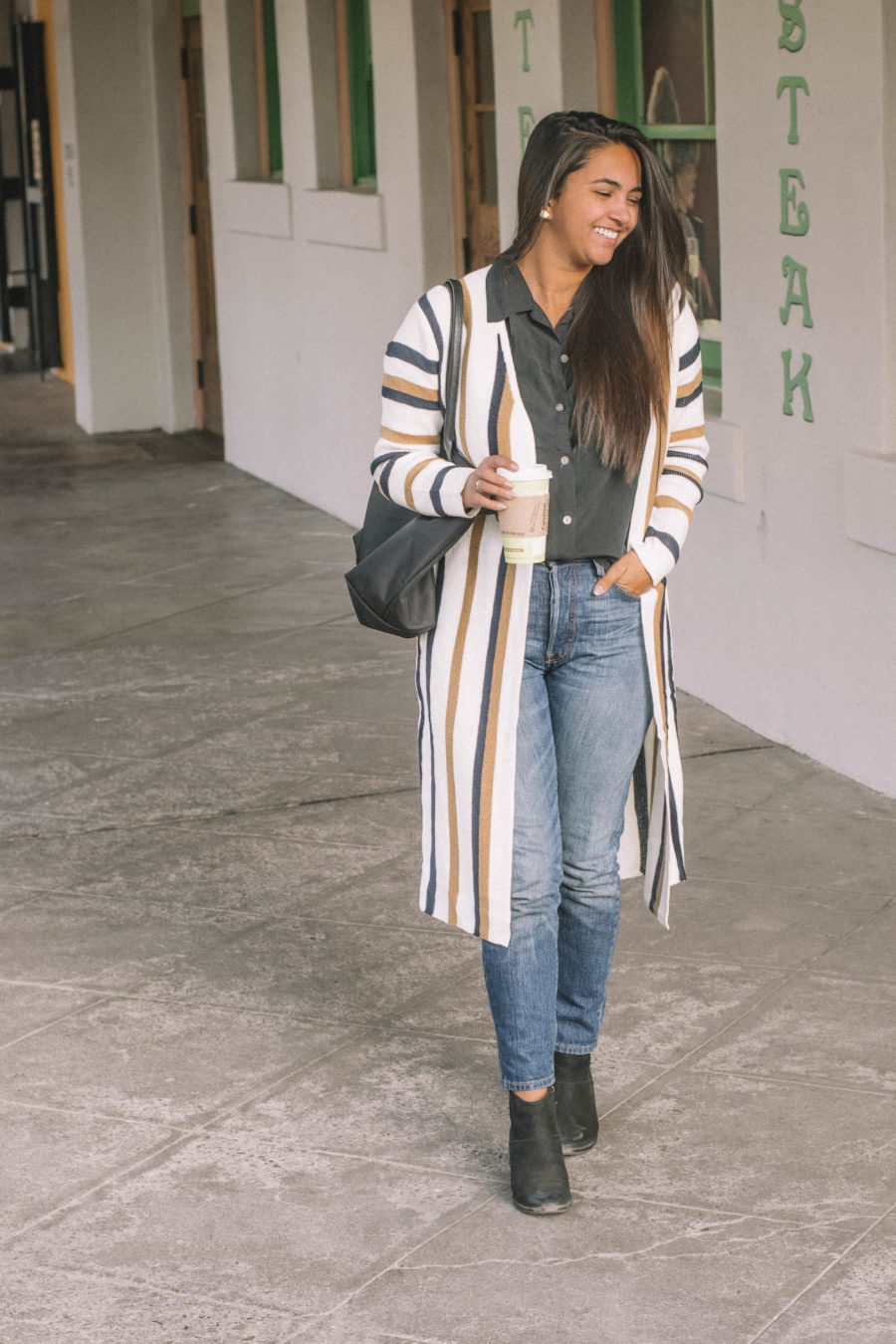 Simple outfits with statement jewelry is my MO. Seriously, when it comes to going out for brunch, drinks, or even date night, I like to change up my accessories to change up my entire look. While this outfit was on repeat during finals week, I’ve been swapping up the cardigans too so no one would know that I’ve just been wearing the same thing.