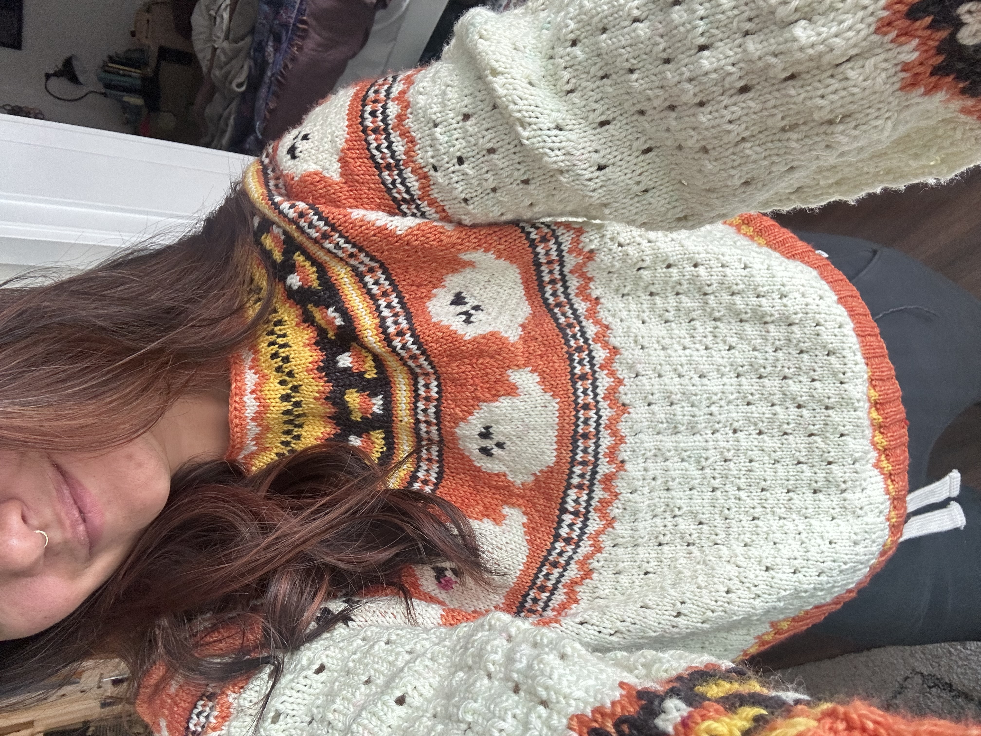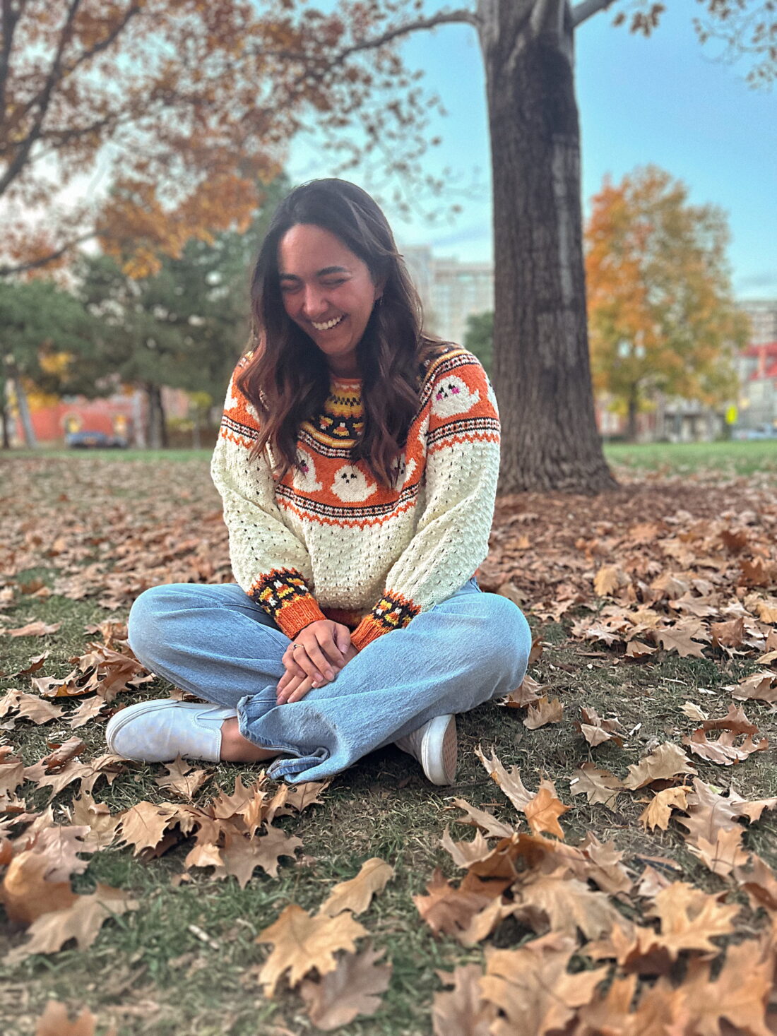 I finally cast-on the project in fall of 2024, with the dream of taking cute photos at a pumpkin patch. I accepted defeat last year and picked up the project again at the beginning of October with the hopes of finishing by Halloween. In classic Kirsten fashion, I “finished” the morning of October 31 (and by finished, I mean that the sweater construction was done, but all the ends of all the colorwork have yet to be woven in).