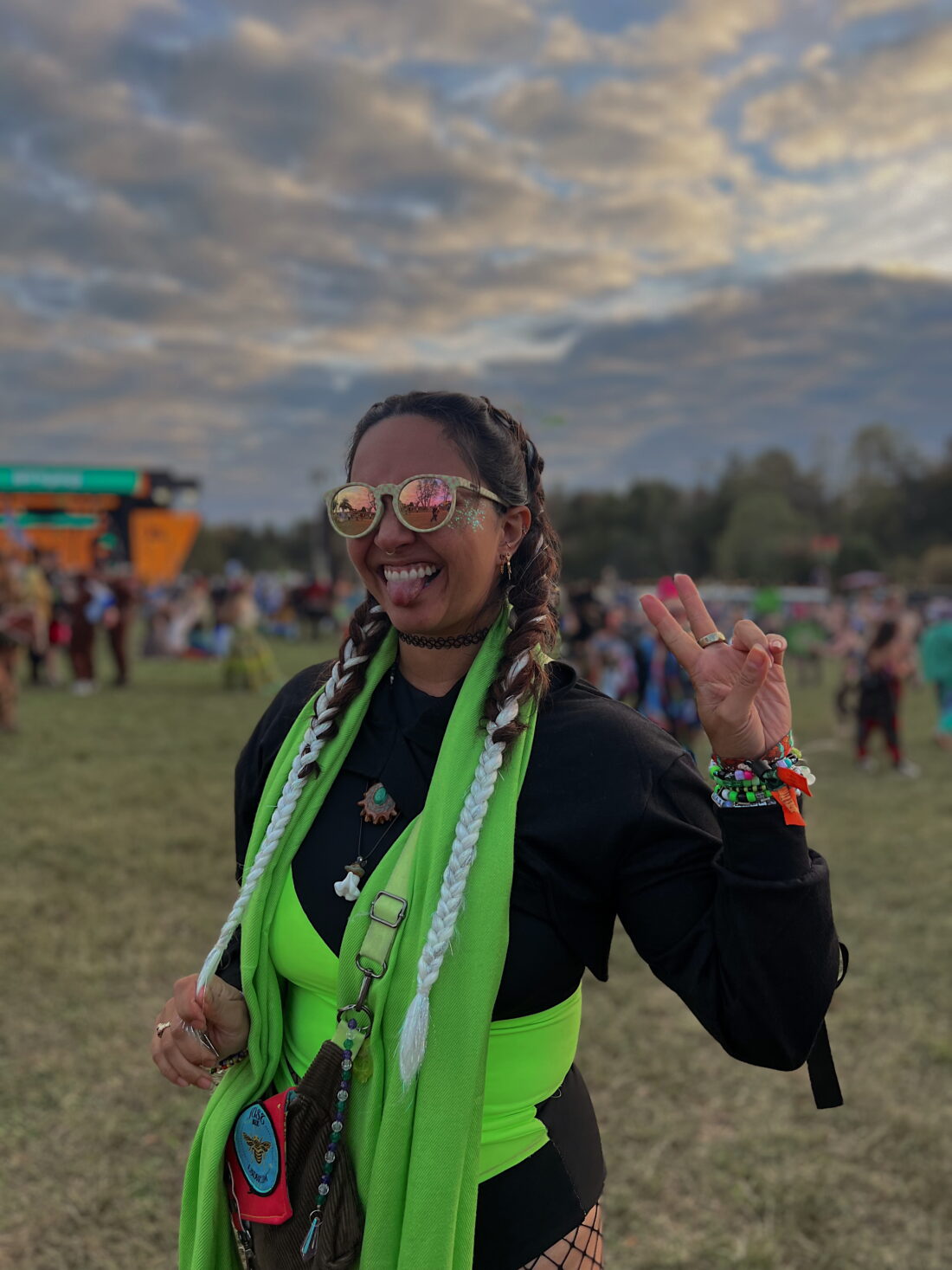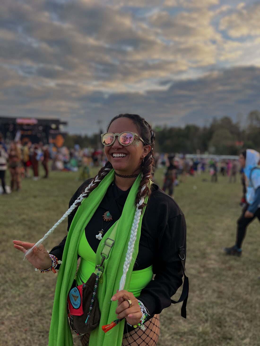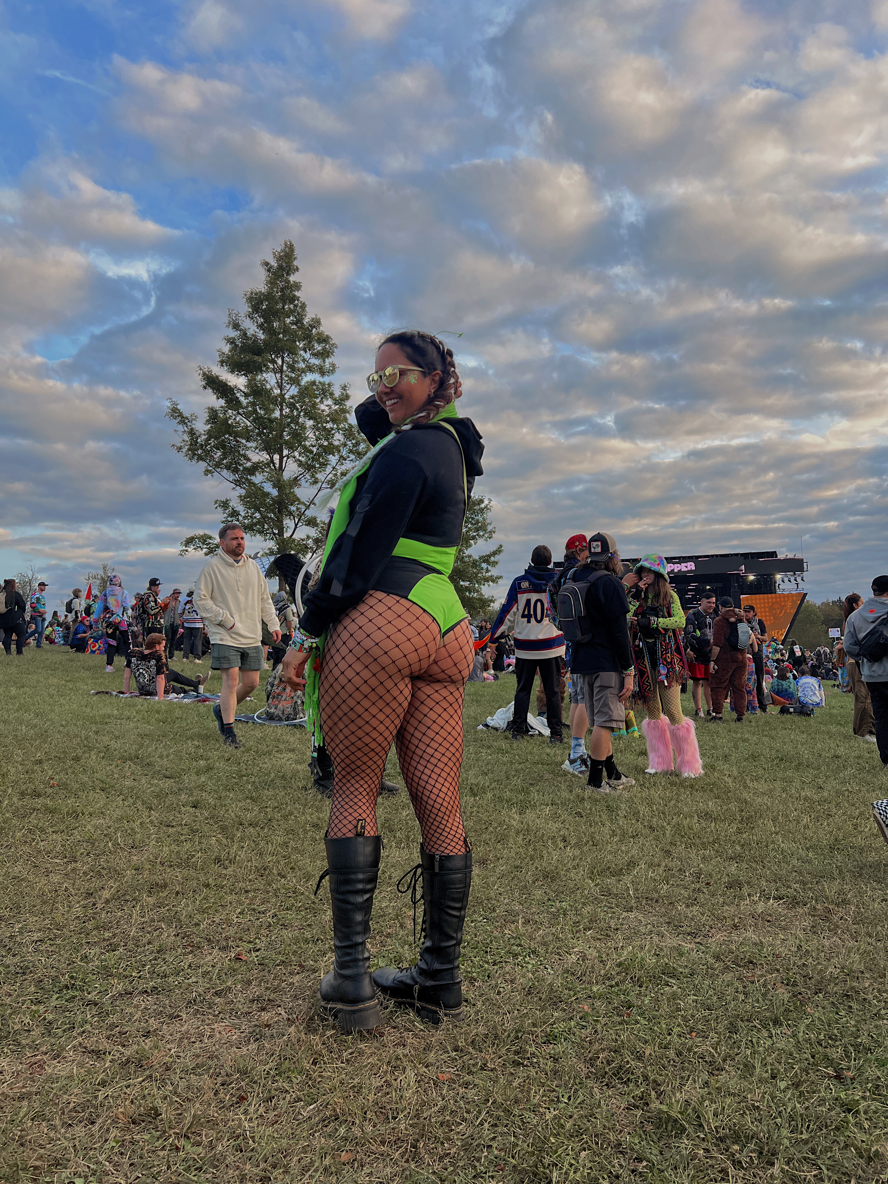 My knee-high Doc Martens were my go-to boots all weekend and I paired this outfit with a matching green pashmina, fishnets, and a cropped hoodie for the cooler weather. I was pretty happy with how it turned out!