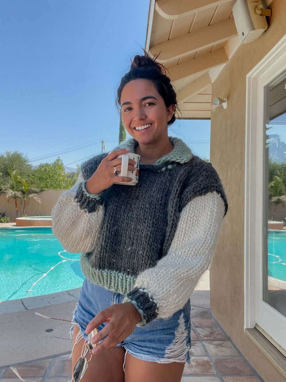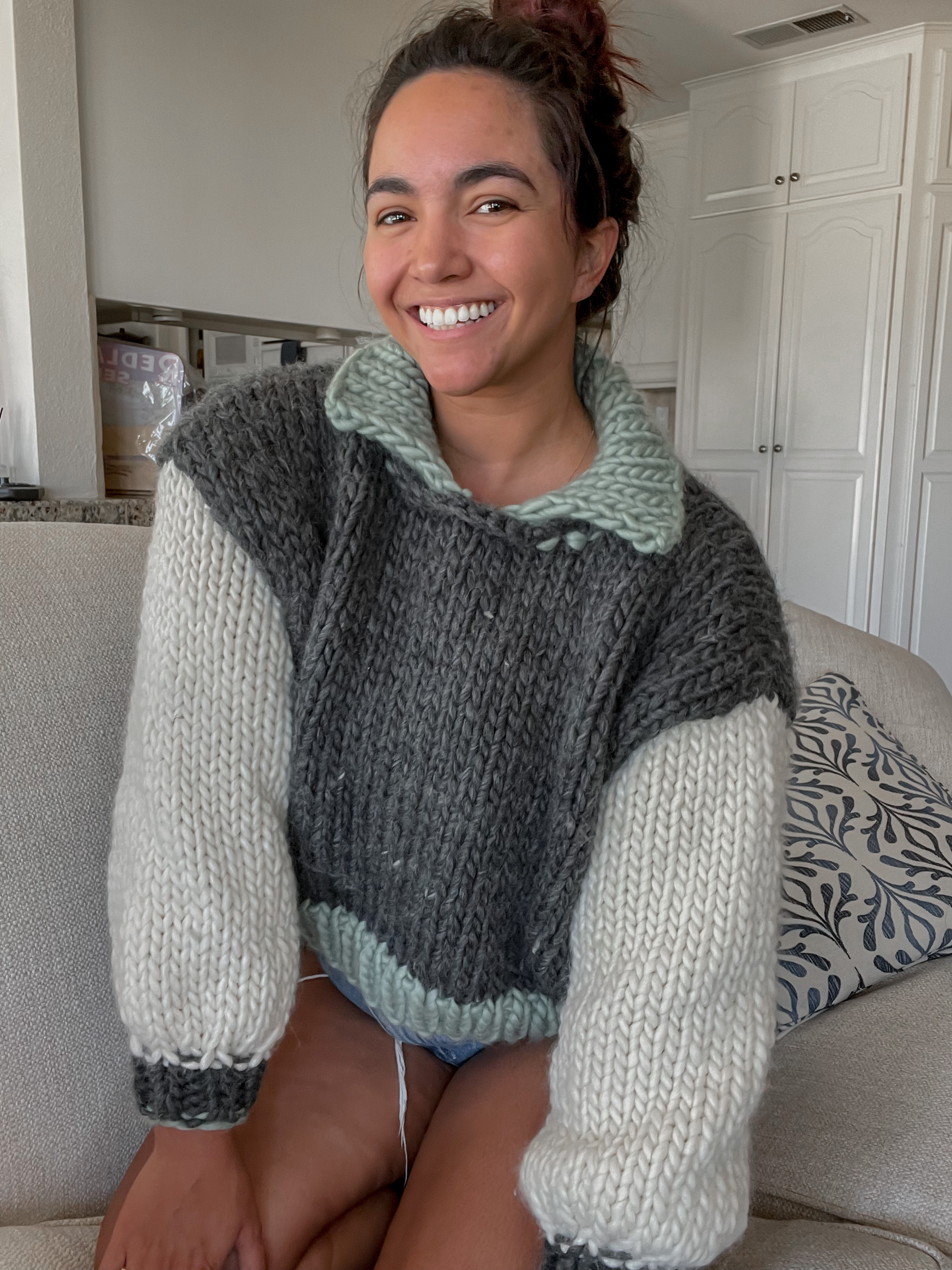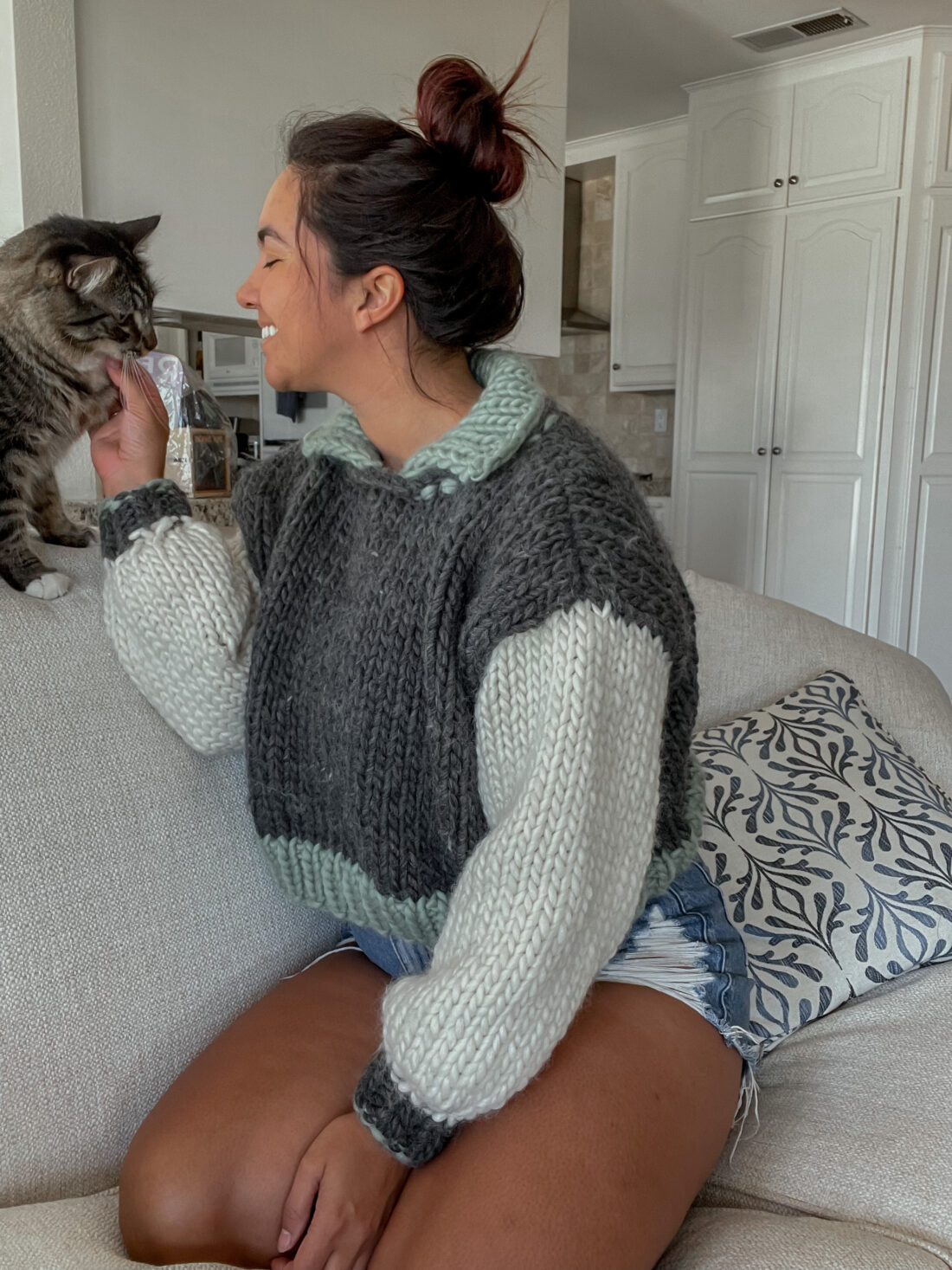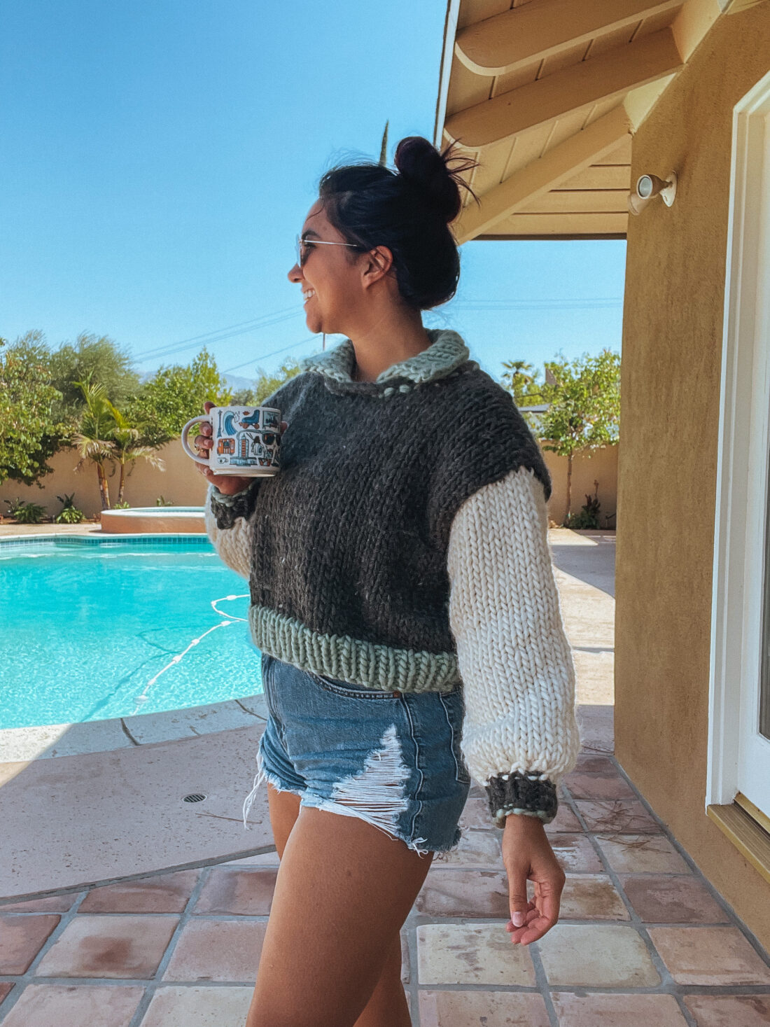 I had a bunch of chunky yarn on hand that I technically was meaning to save for another project, but when Kara from @karas.knit.eng shared her test knit for the Marco Polo Sweater, I thought it would be the perfect opportunity to use it. The collar and bottom ribbing uses Wool and the Gang’s Crazy Sexy Wool in Eucalyptus (Get 15% off using my link!) and the body and sleeves are knit in Buttercream Cozy, which was a thick wool/acrylic blend that has recently been discountinued.