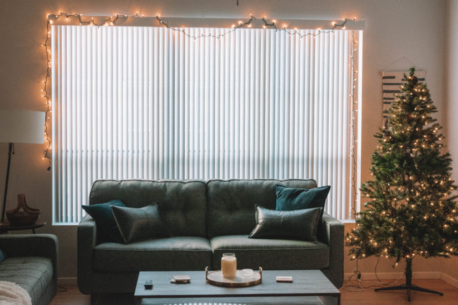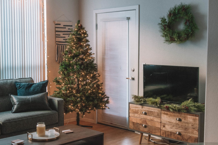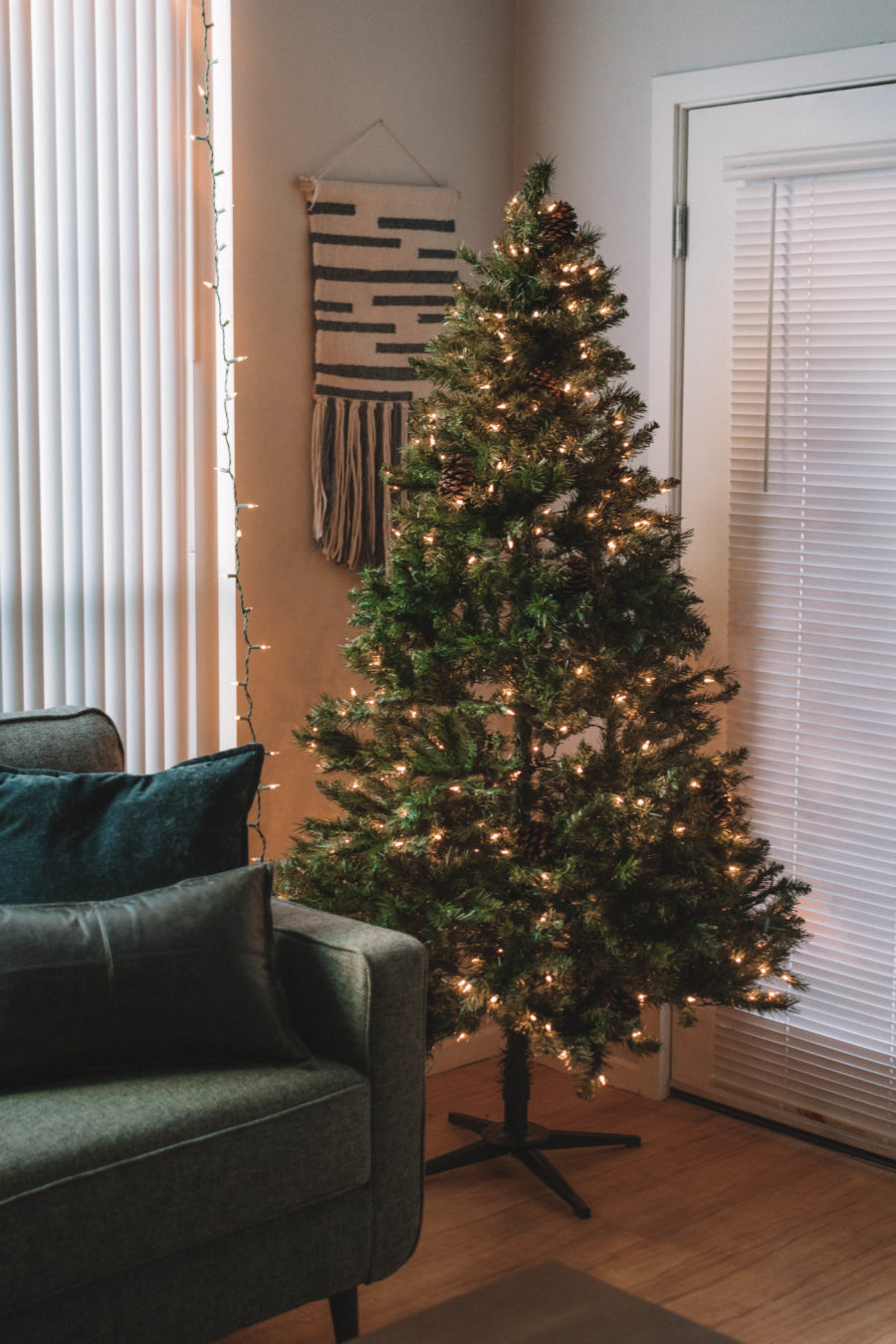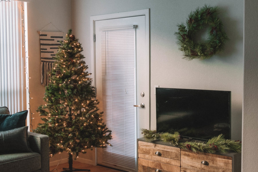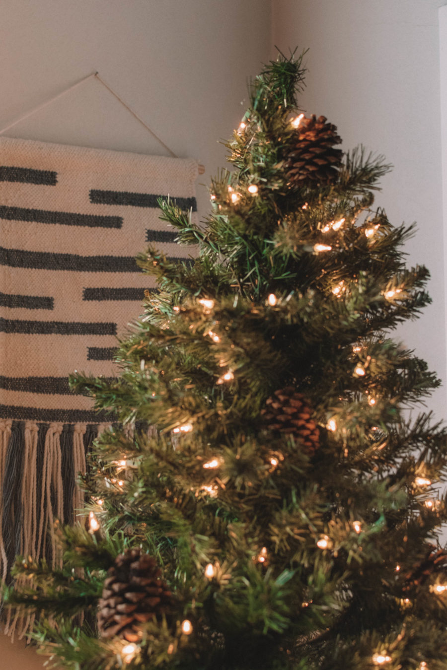 We didn’t have ornaments, but my roommate picked up some scented pinecones and put them in the tree as decorations. We have a box of gold ornaments we plan on using too, but the pinecones with the lights provides a minimalistic, but still decorated feel.