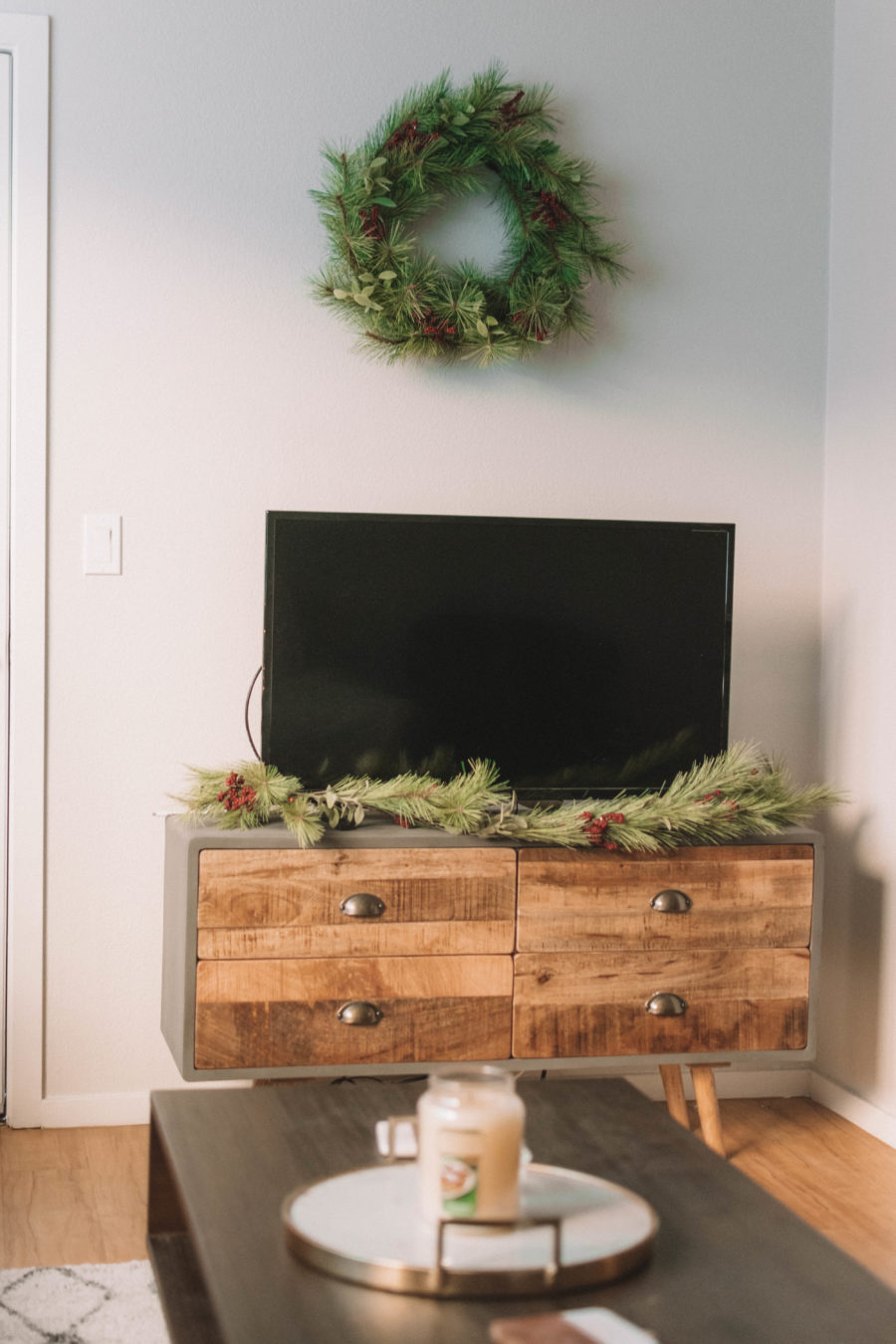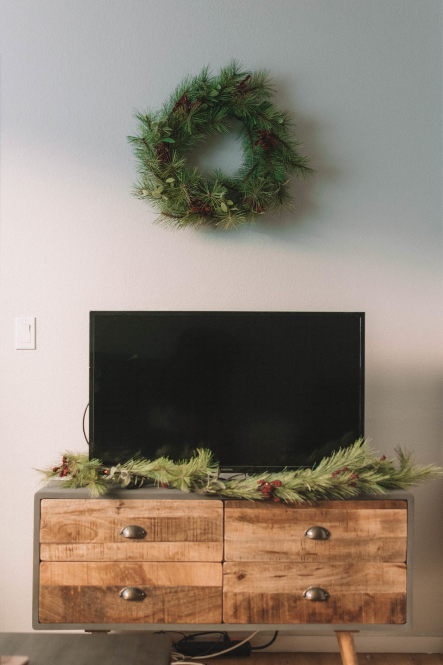 I ordered these right before Thanksgiving (and my dad helped me hang the wreath on Thanksgiving weekend) with two-day shipping. However, I just checked online and both the garland and wreath are available in my local store! Even though my store might not be your store, there are a tob of decorations you can purchase online and pickup within hours for easy speedy decorating. Plus, how cute does this garland look with our media stand? It’s available at Ashley Homestore!