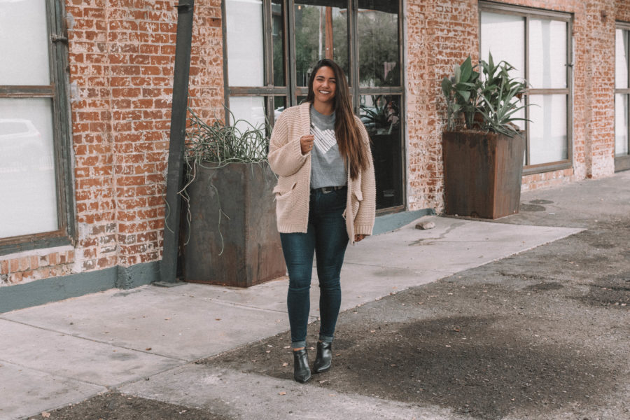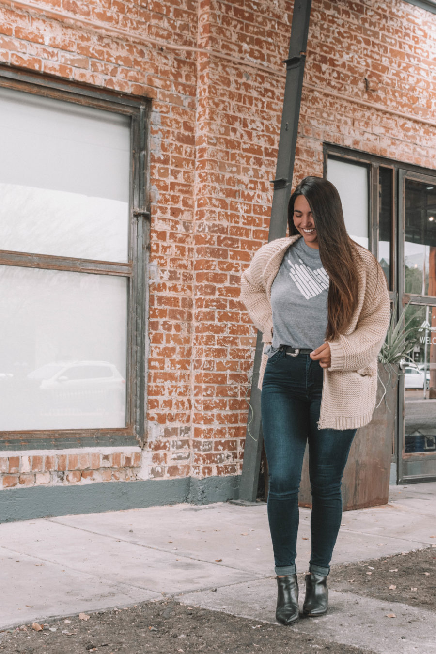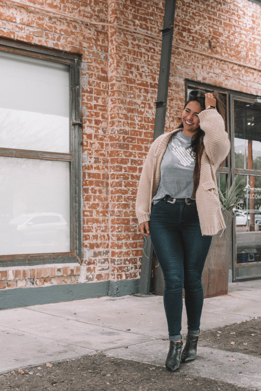 I almost got this shirt in blue, but got this shirt in grey as well. Grey is just so easy to match! I paired this tee with neutrals: an oversized cardigan, my signature skinnies, a double-buckle western style belt, and a pair of pointed toe booties for added edge.