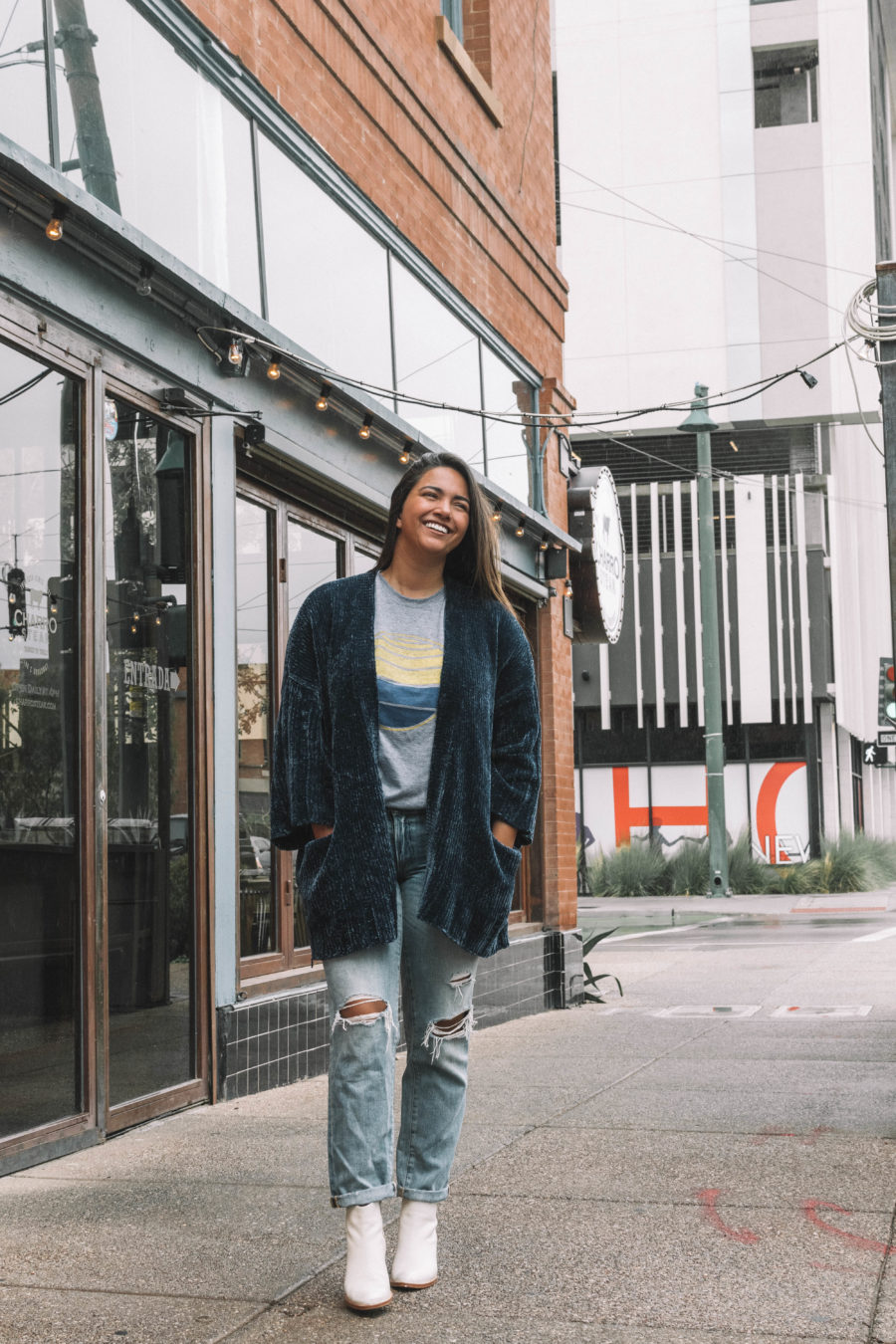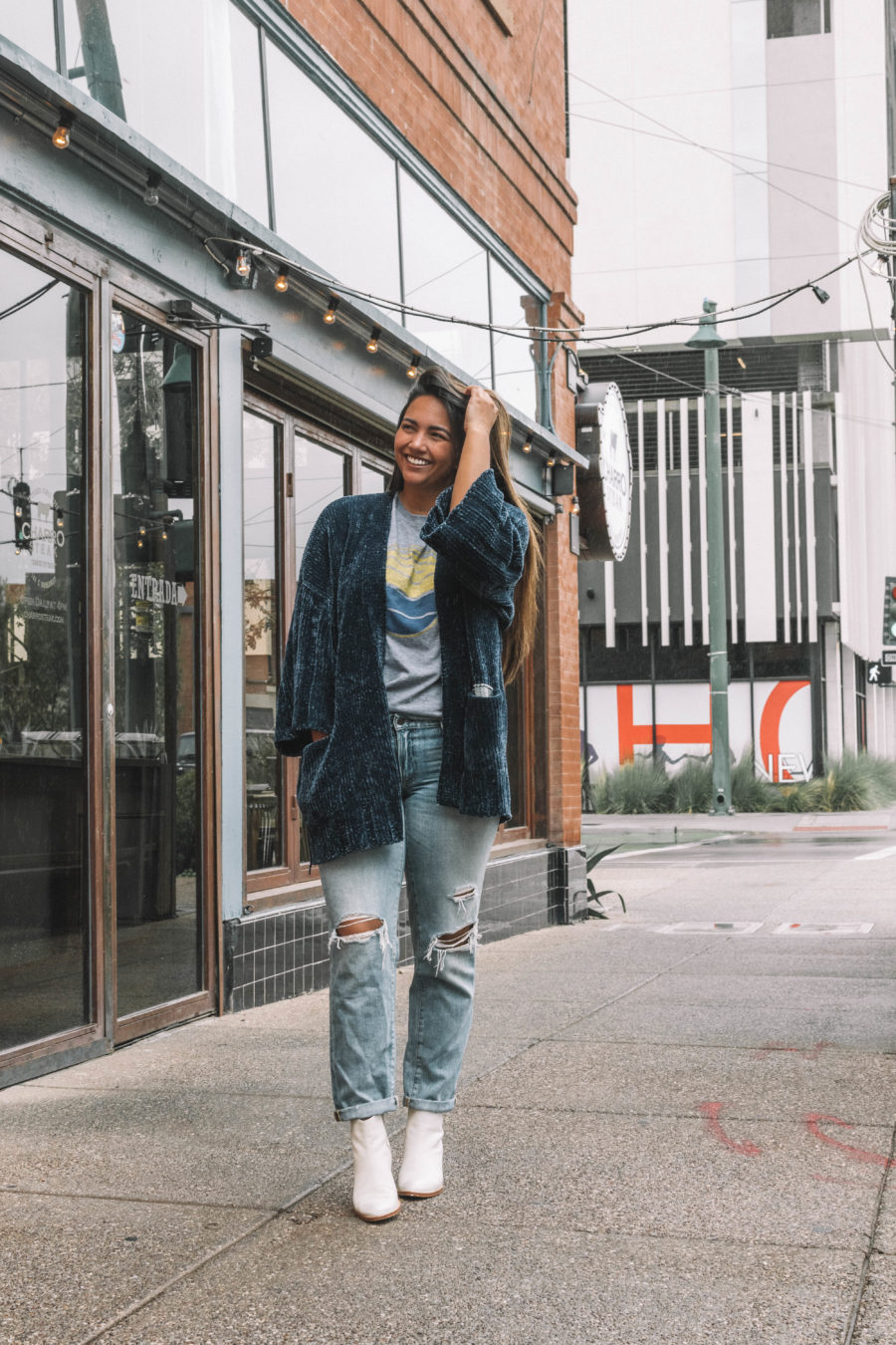The navy on this shirt matched perfectly with my navy chenille cardigan, which I dressed down with a pair of boyfriend jeans and white booties. This look is cozy and casual, everything you need for a fall weekend.
