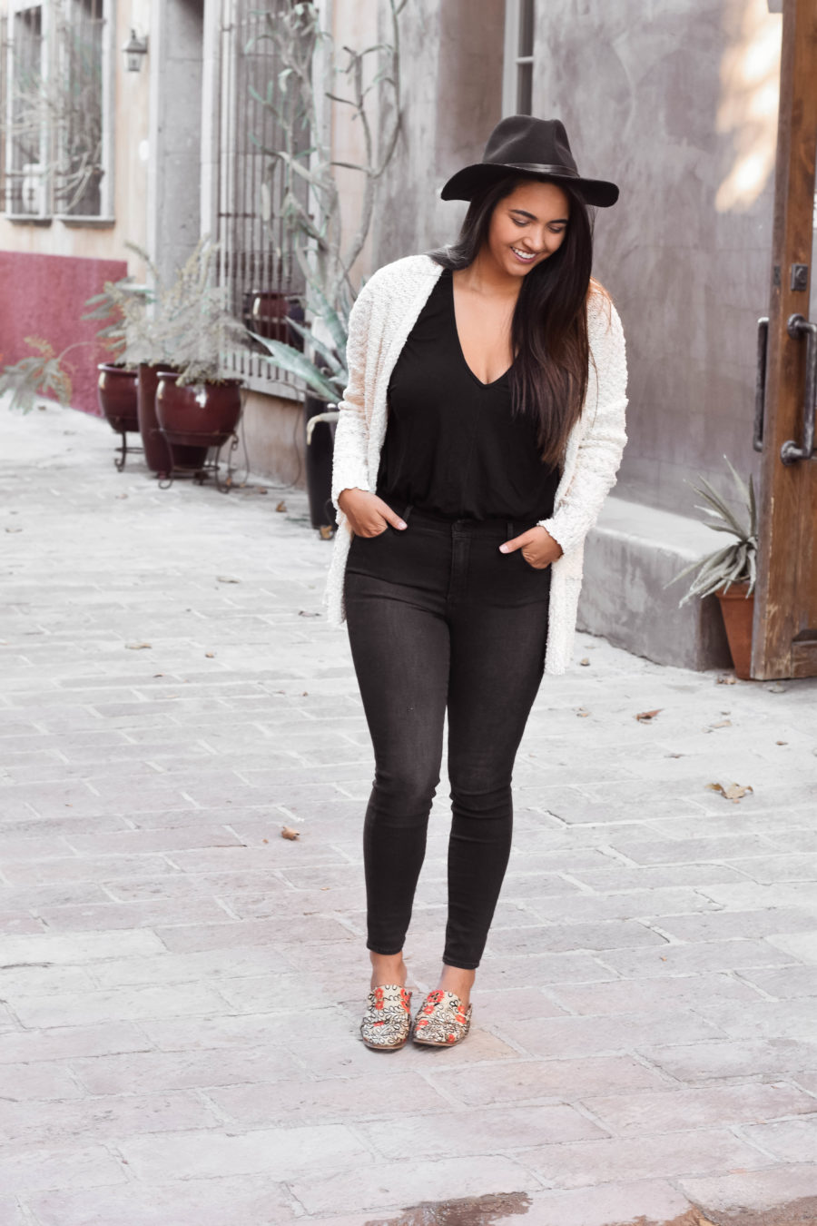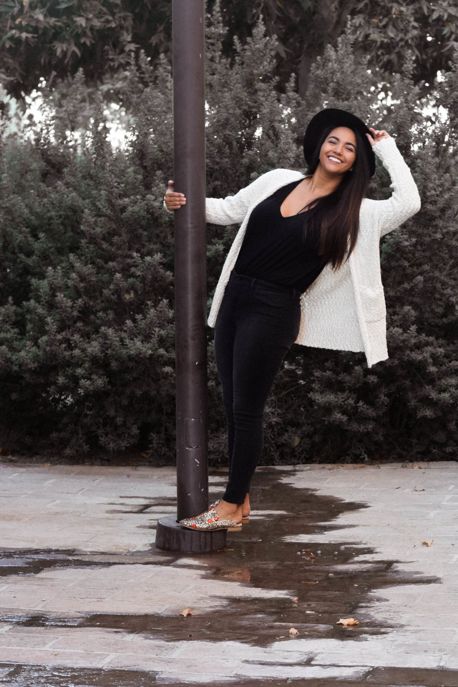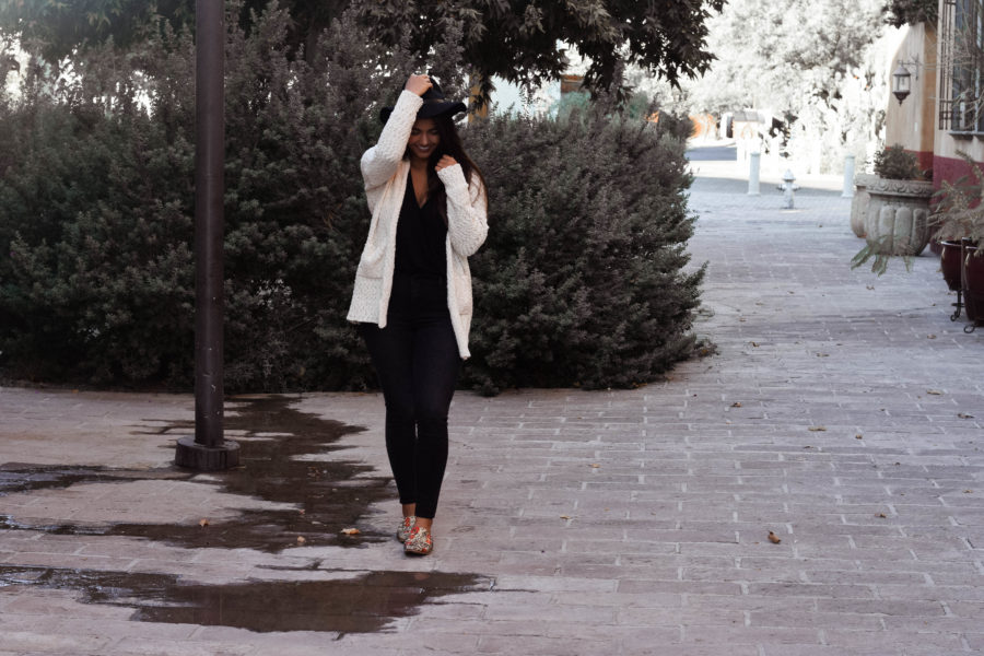I aimed to build this outfit around these gorgeous statement shoes, so the black outfit and cream sweater seemed perfect. Next time, I may switch up the black jeans for my new favorite pair of Levi’s (seen in this post), but otherwise, this outfit still turned out pretty dang cute.
