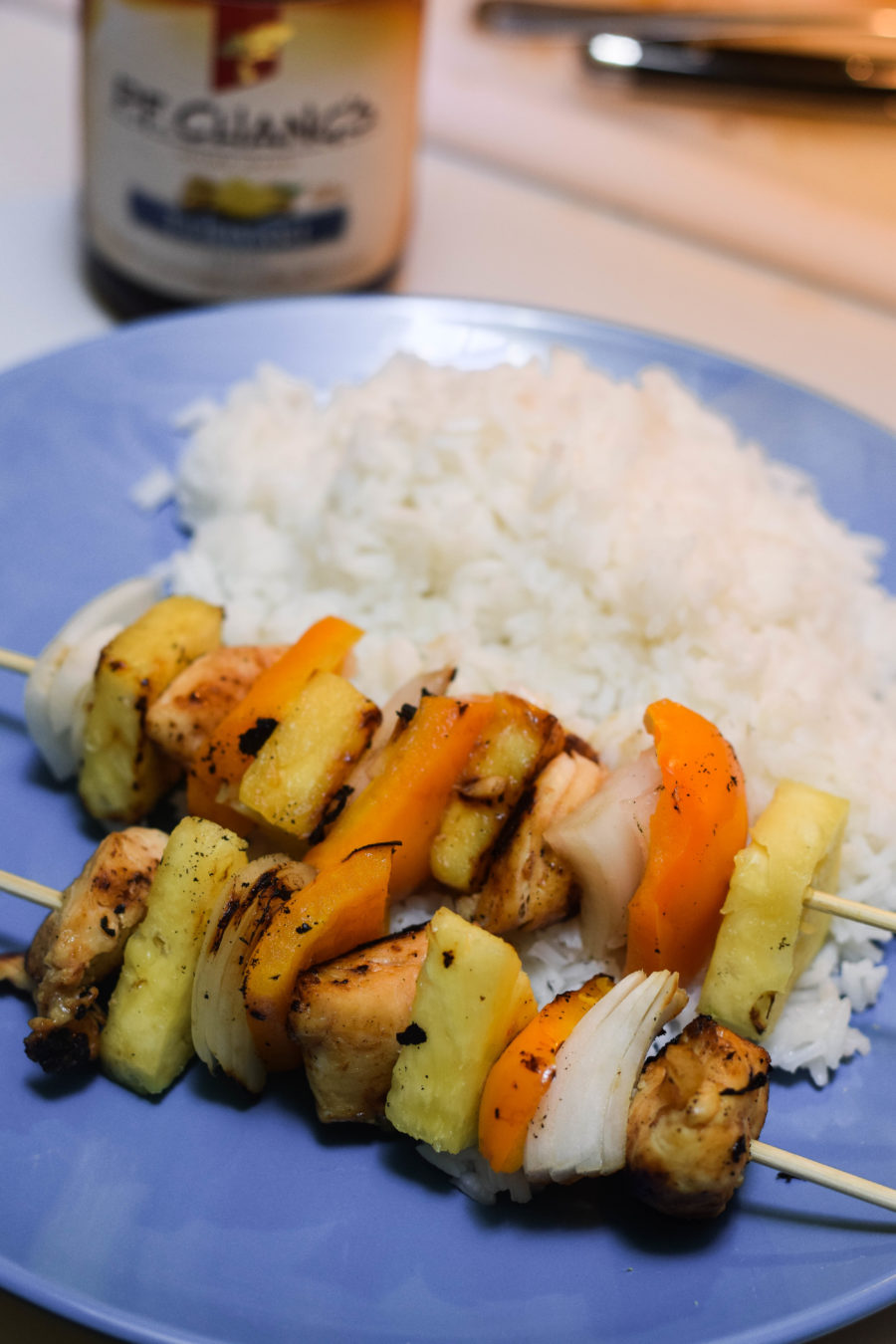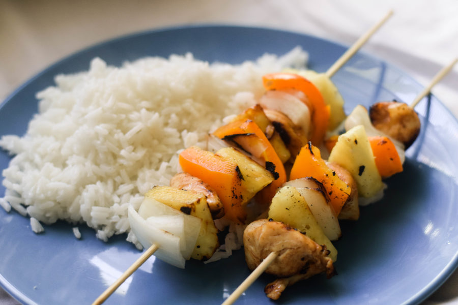 Kabobs are just fun. They’re so easy to make too! Just put one piece of raw chicken, a piece of an onion, a piece of a bell pepper, and a piece of pineapple on the grilling skewer until all of the pieces are gone. Then, just place the skewers on a grill until they’re cooked! I served them with rice, but that’s completely optional. It does help fill you up and is the perfect addition to the Teriyaki chicken!