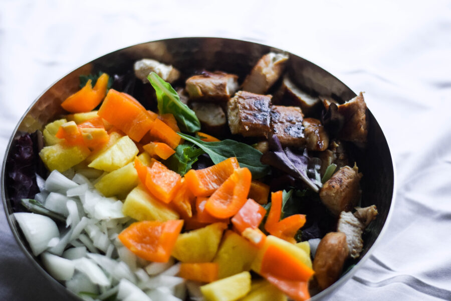 I loved the addition of bell pepper to this salad! It definitely adds a unique flavor. For a little extra added flavor, you could grill the bell pepper, onion, and pineapple (if you made the kabobs, just take them off the skewer and serve on a bed of lettuce)!