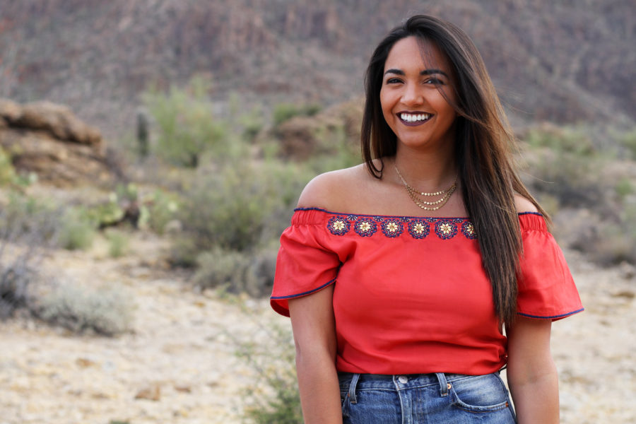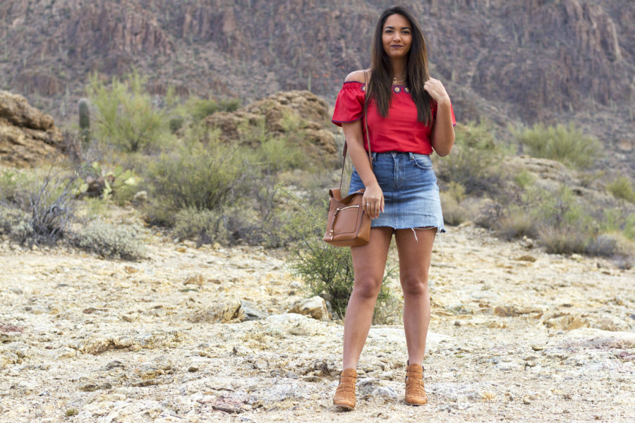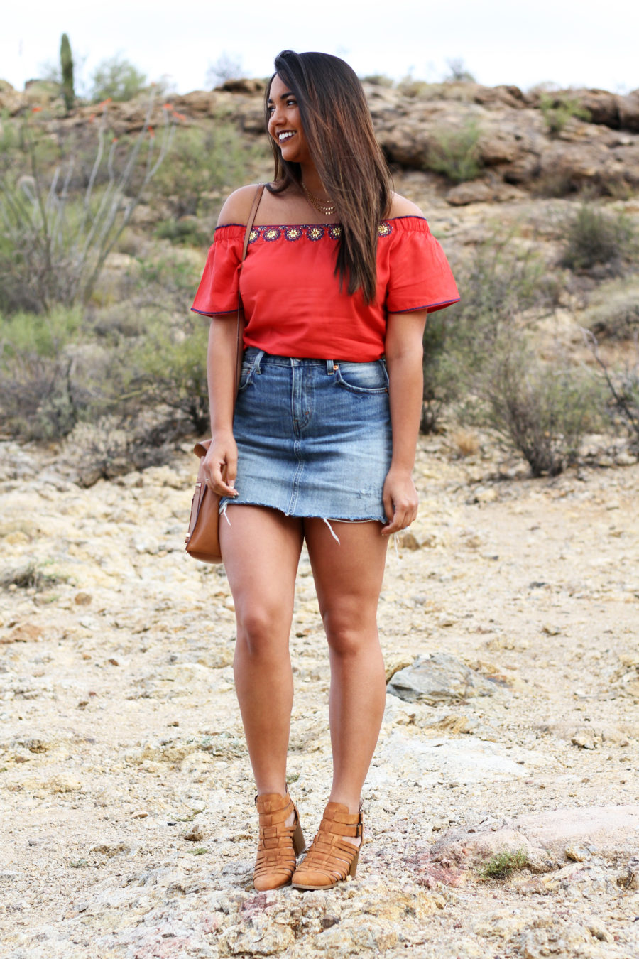 Today, I present you with the most Arizona-esque outfit I will ever wear. I’m just not sure it gets more desert-y than this right here. The off the shoulder top with beautiful embroidered details is reminiscent of the Spanish influence and the bright colors are perfect against the brown desert background. I know I don’t break out the really bright colors too often, but how could I not with a top this beautiful?
