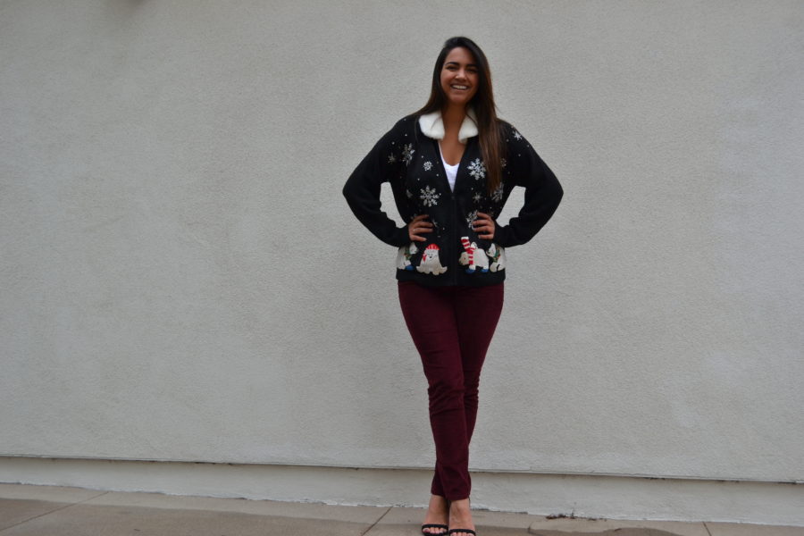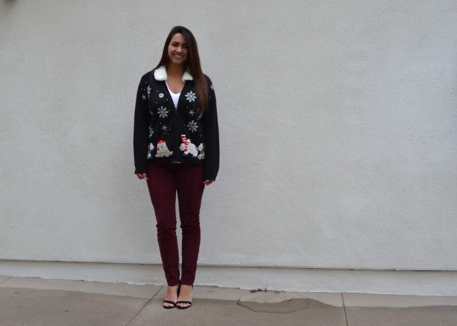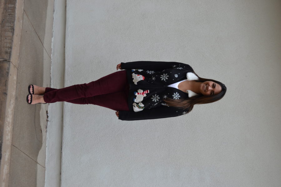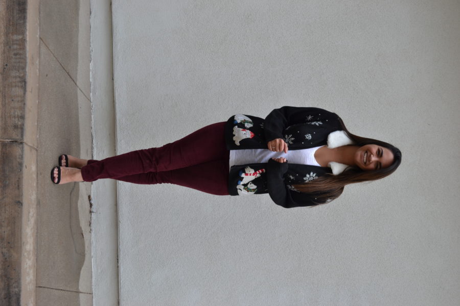 I honestly wish I owned a Christmas sweater. You’re probably looking at me and saying “well what are you wearing then?” This is my mom’s. Half of my wardrobe comes from her closet. I love this zip up sweater with it’s faux fur linking and the cute little polar bears at the hem. Adorable.