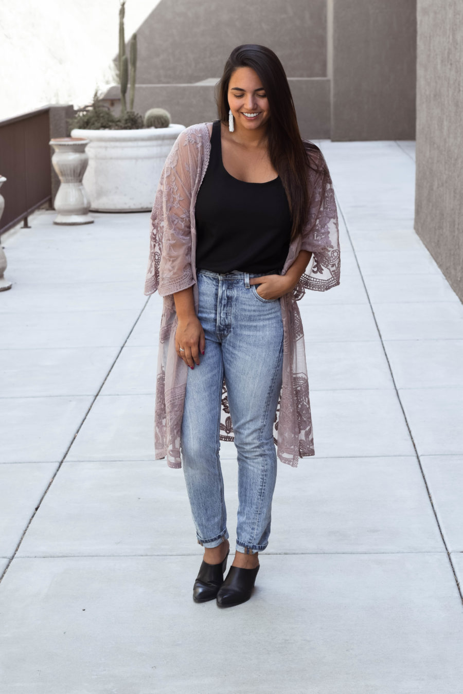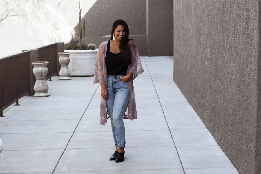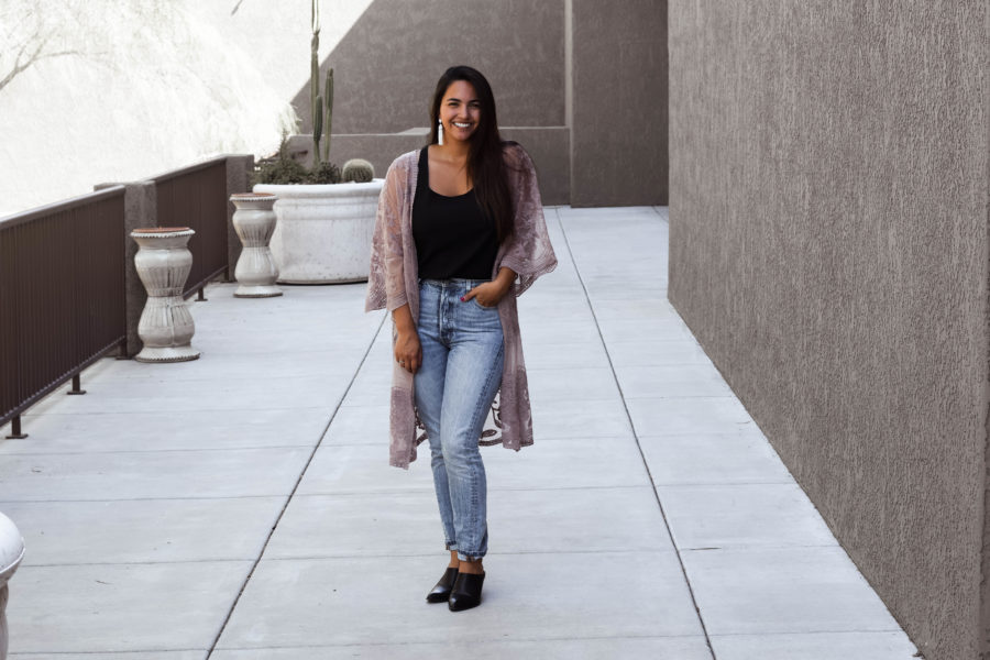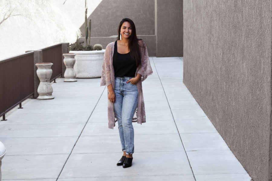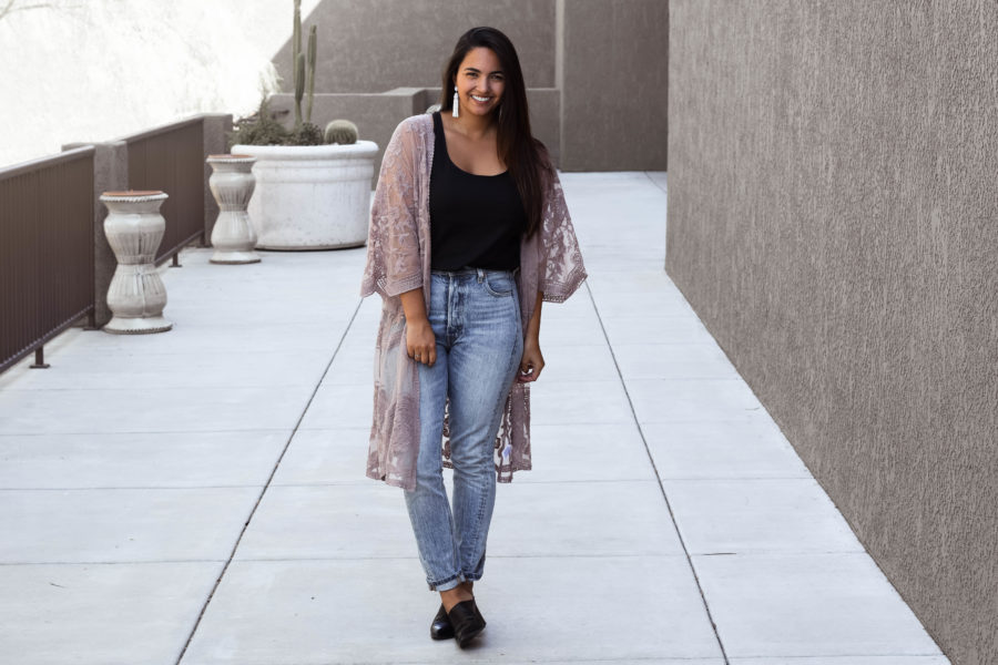 As I said, I wore this outfit out and about on Friday and received endless compliments. I did some errands running around town and so many people stopped me to compliment this lace kimono. It’s easy to see why. This kimono is perfect for the Arizona fall weather. It has just enough fall vibes without being a too-heavy cardigan in the hot weather.