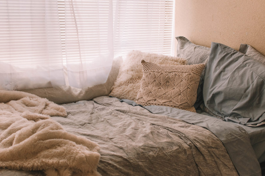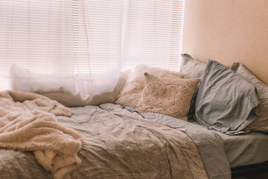 - Indulge in cozy bedding. When I moved into my apartment, I needed full-size bedding. I invested in a set from Cstudio Home and there was no going back for me. I swear, all my bedding from this point forward will come from them. Their cotton sheets are perfect in the Arizona weather, so I never get too hot when I sleep! I also use their lightweight comforter and it’s the perfect weight for feeling cozy without overheating. My current set of bedding was inspired by my parent’s old place in Half Moon Bay, with gray stripes reminding me of the ocean on a hazy day with some light blue sheets. The crochet pillow covers also fit perfectly into my bedding theme.
