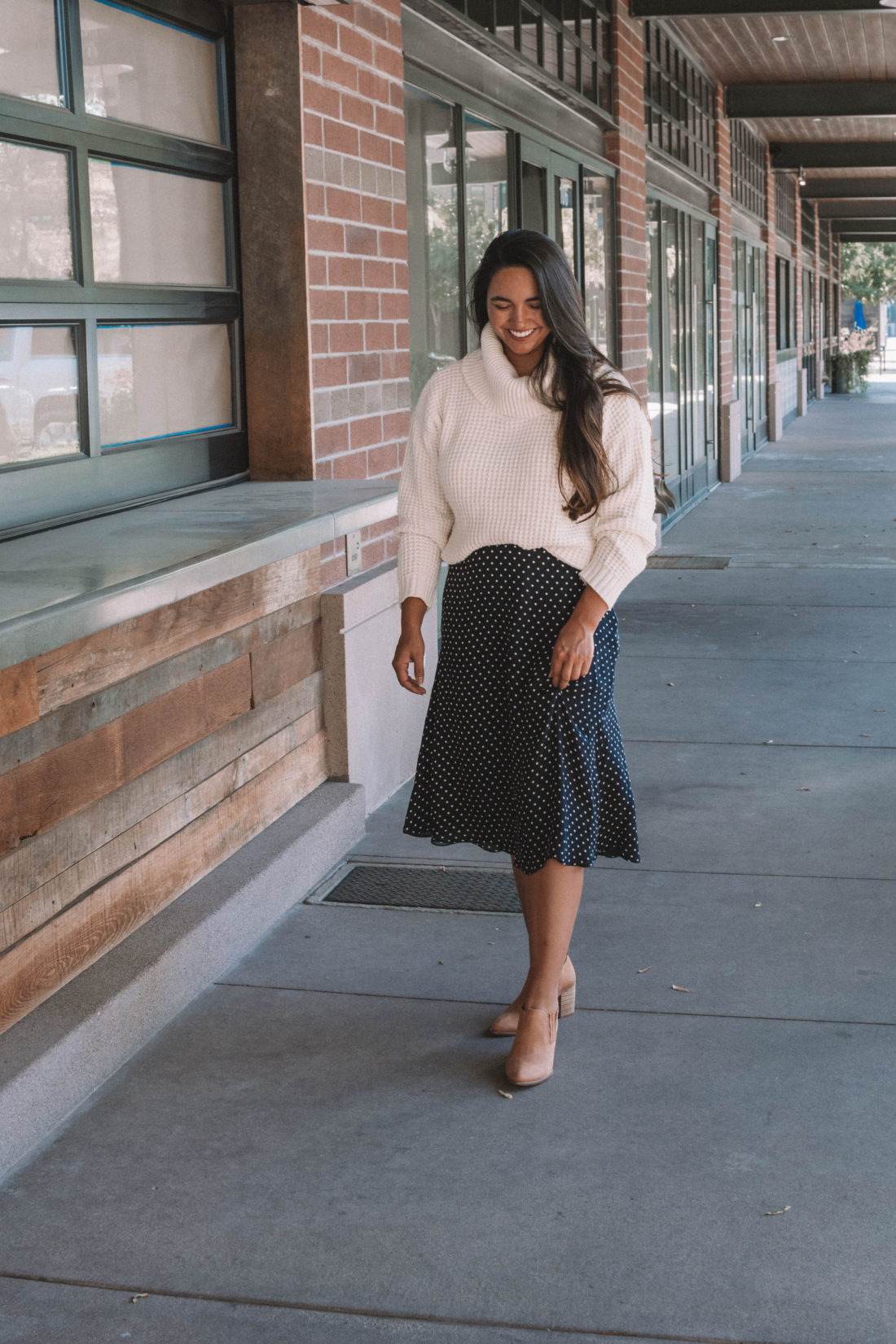 I love skirts. Can you tell? I’m sure you’ve noticed my recent love for midi skirts – this isn’t the first one I’ve picked up this year. The navy color and fun polka dot prints makes this one fun for summer, but paired with an ivory sweater, it can transition seamlessly into fall.