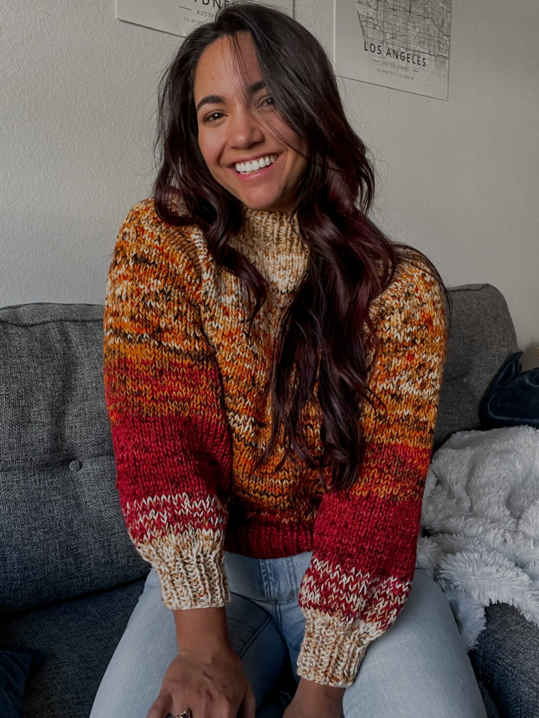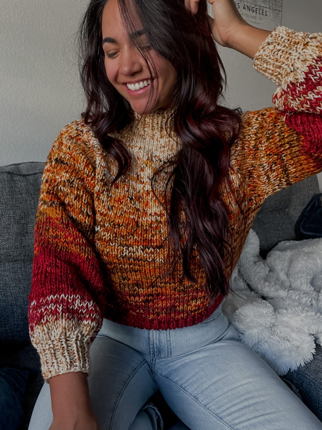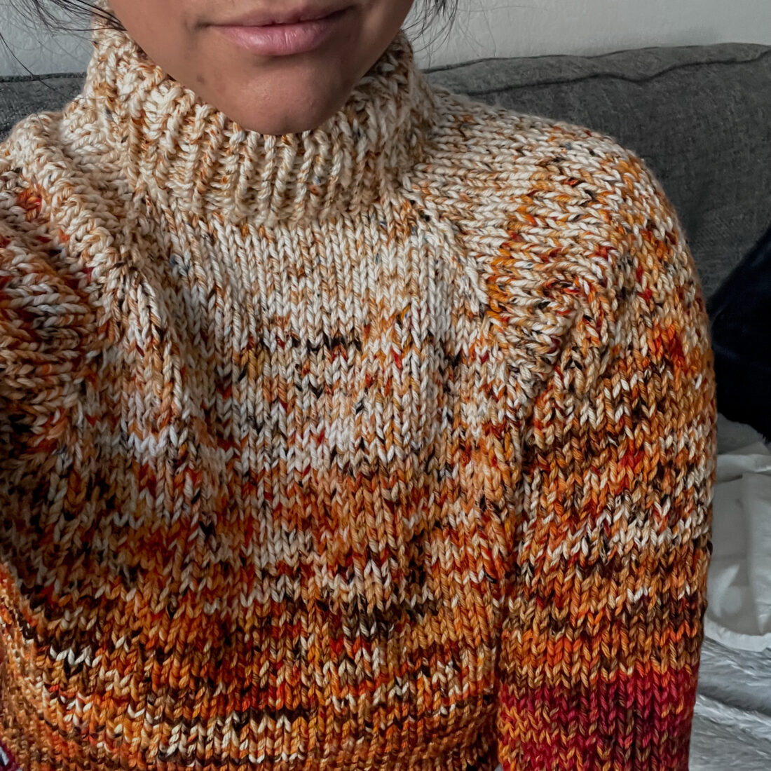 With this knit, you also get the perks of knitting with bulky yarns: fewer stitches, fewer rounds, and a relatively fast finish compared to finer‐gauge sweaters. Dividing the sweater into color sections gave me ADHD brain tangible goals to hit each day, which also helped this sweater come together faster.