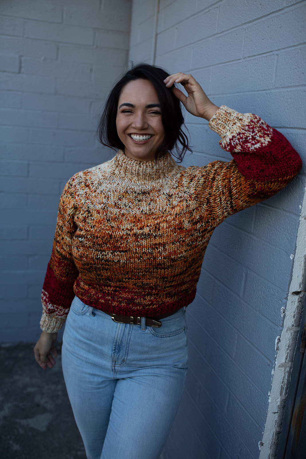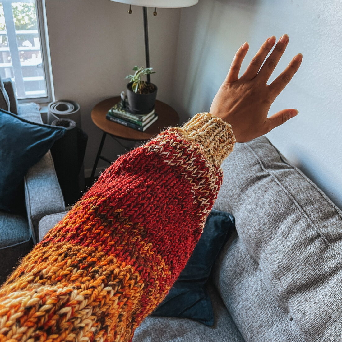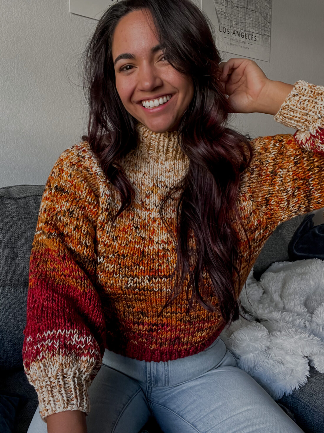 With this knit, you also get the perks of knitting with bulky yarns: fewer stitches, fewer rounds, and a relatively fast finish compared to finer‐gauge sweaters. Dividing the sweater into color sections gave me ADHD brain tangible goals to hit each day, which also helped this sweater come together faster.