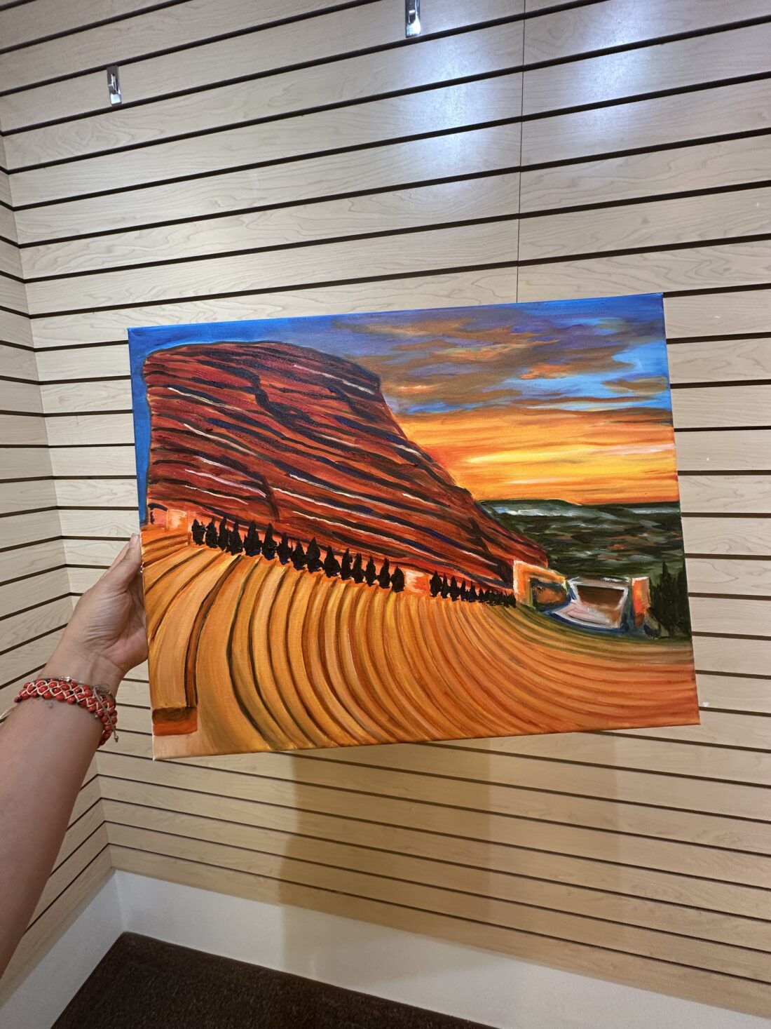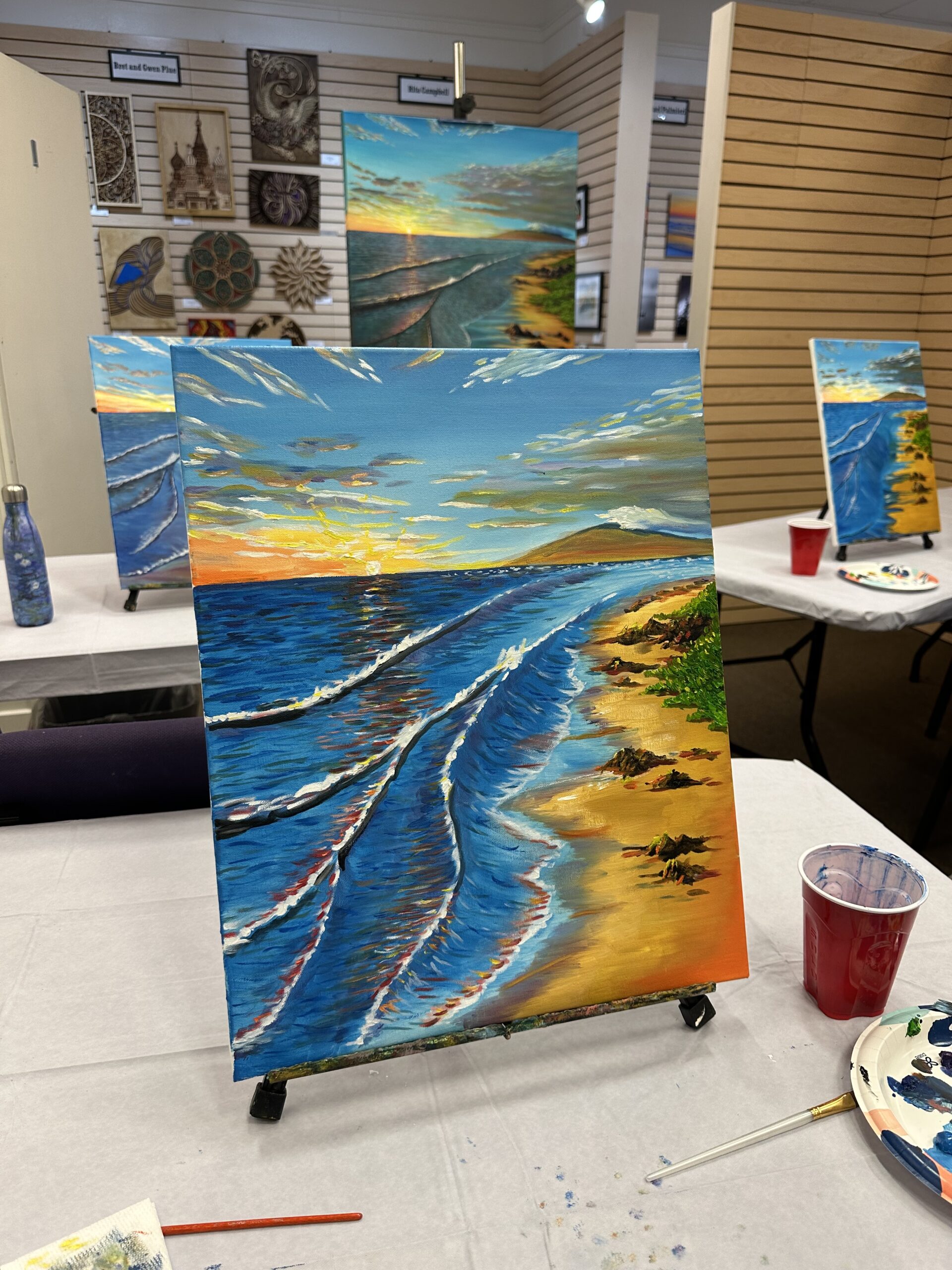 There are a few regulars in the class who are fun to paint with, and I feel like I learned so much right away about painting with oils. I kept going back for a few classes, including a painting of a beach landscape and a Red Rocks sunscape.