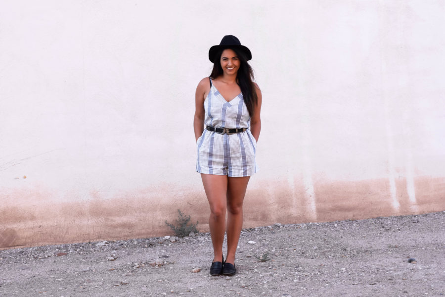 Buy your accessories in easy-to-match colors like black or tan. All of the accessories I’m wearing here are black and matched perfectly with my romper. By buying solid matching colors, I avoided having to match a bunch of different colors and patterns.