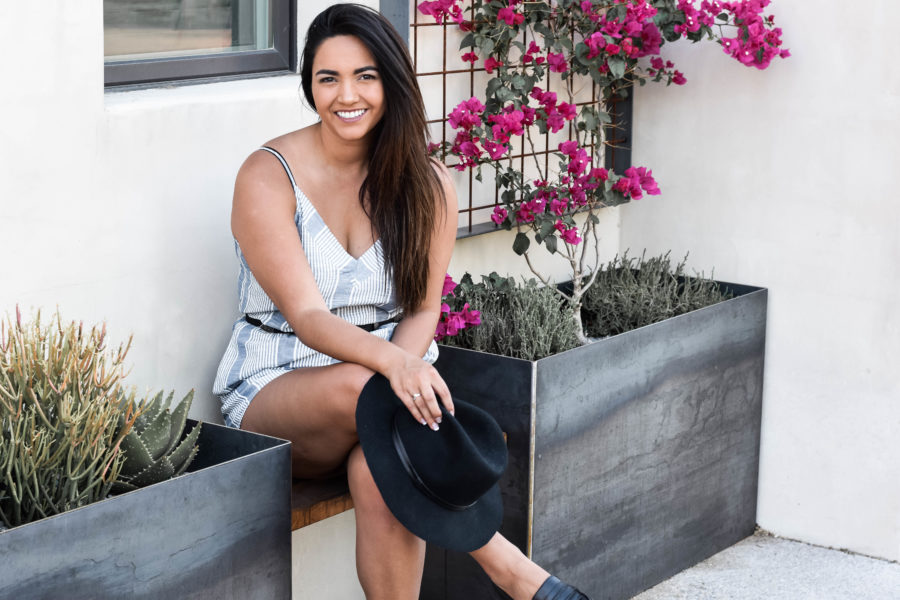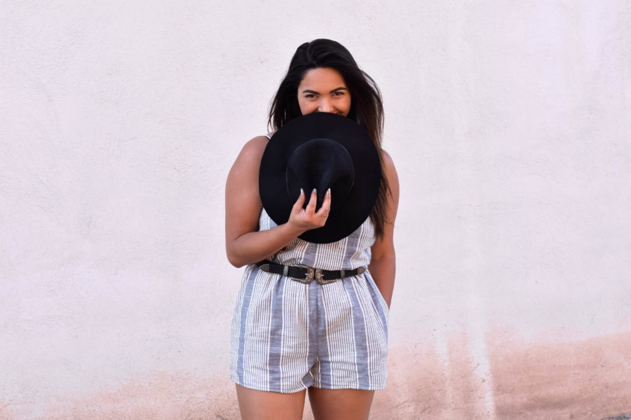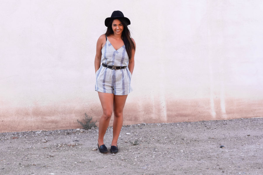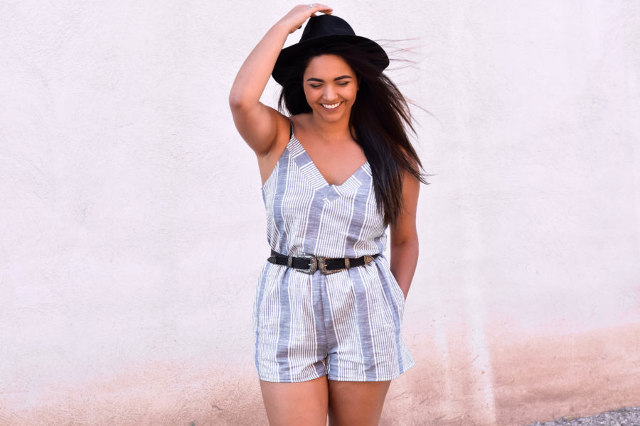 Buy your accessories in easy-to-match colors like black or tan. All of the accessories I’m wearing here are black and matched perfectly with my romper. By buying solid matching colors, I avoided having to match a bunch of different colors and patterns.