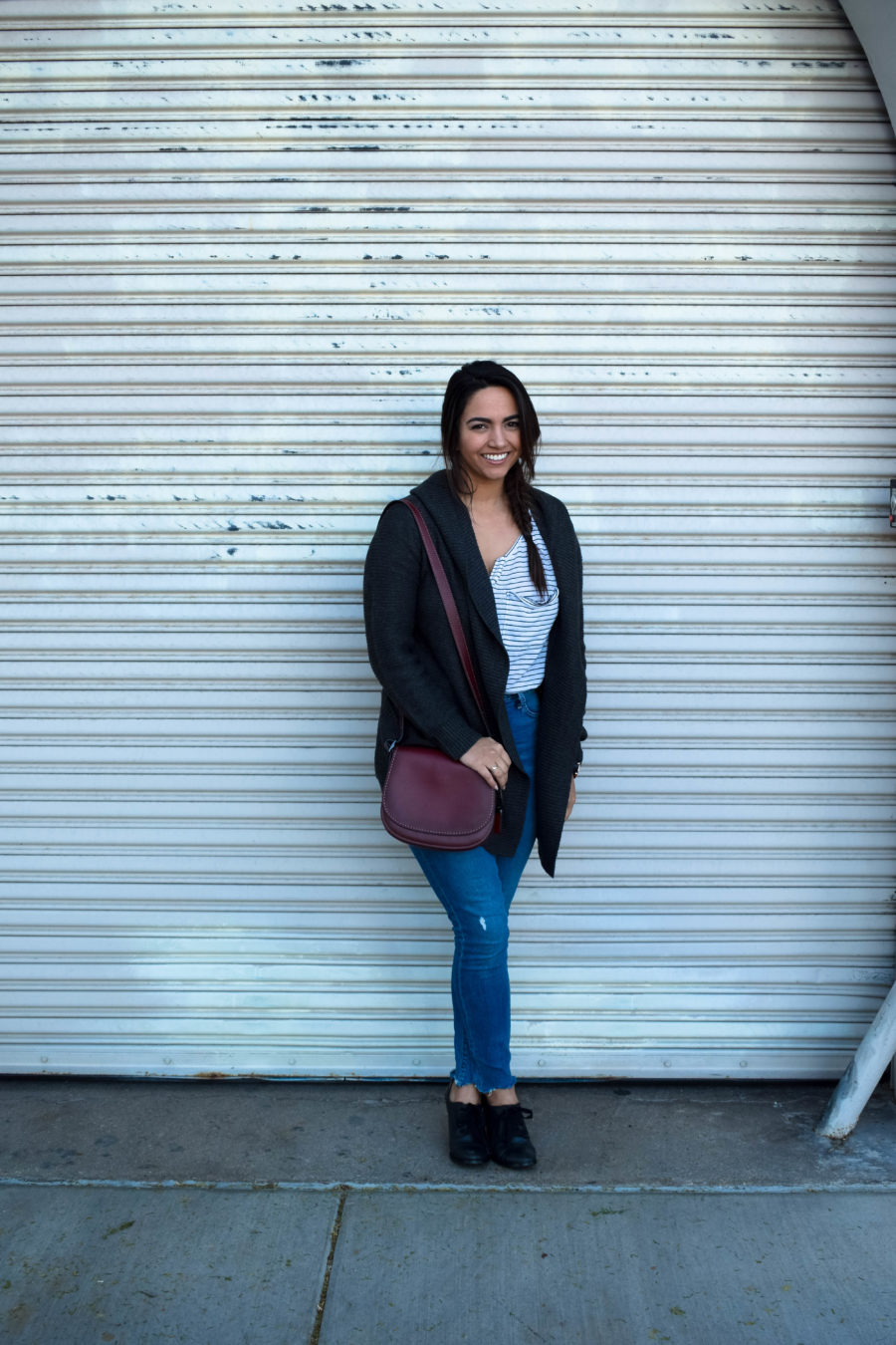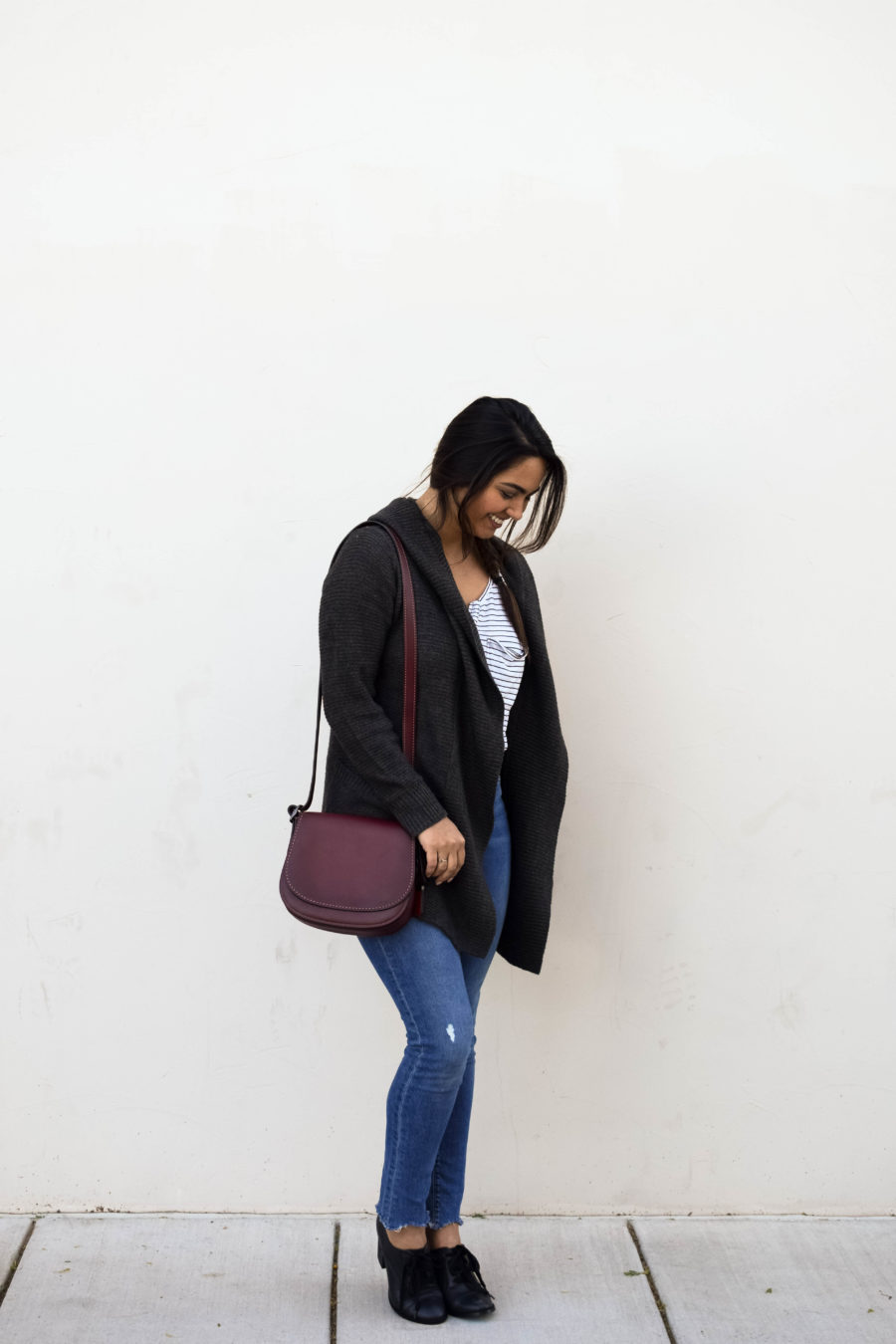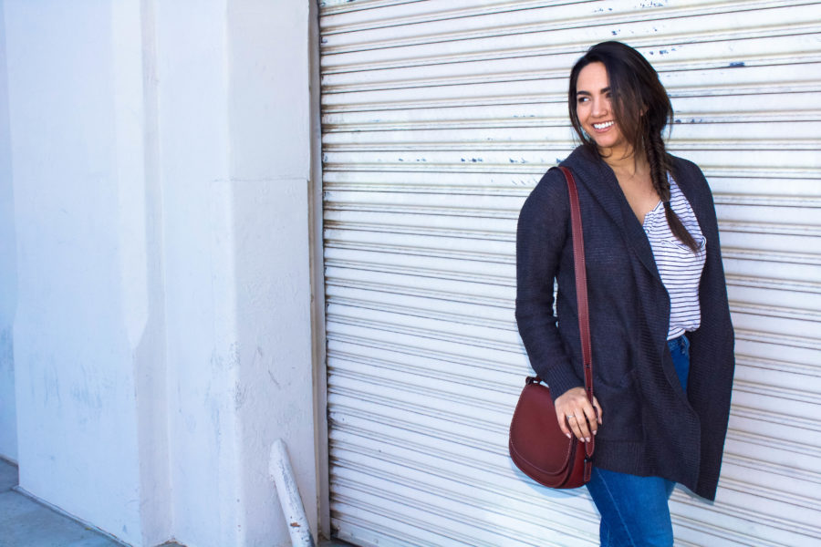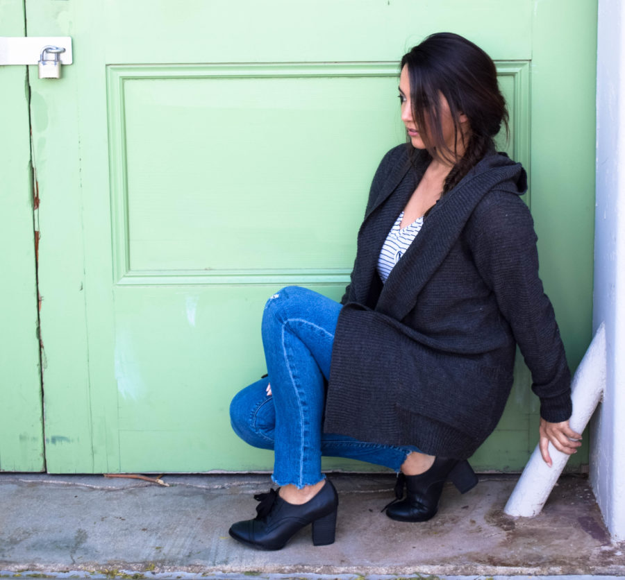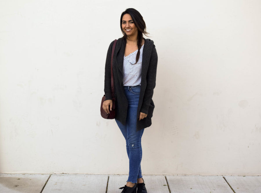 I listed this striped shirt once on Poshmark and despite the interest in it, it never sold. So, I finally bit the bullet and put it back into my closet where it’s currently living a great second life. The sweater is the perfect blanket sweater from my girls over at Maude boutique, complete with a cute little hood for those days where I just don’t want to make eye contact with anyone. This pair of jeans was a more recent purchase. After seeing these frayed hems everywhere, I bit the bullet when I saw this pair from Lucky Brand. They were half off too! I love Lucky Brand, so this is another one of my favorite new additions.