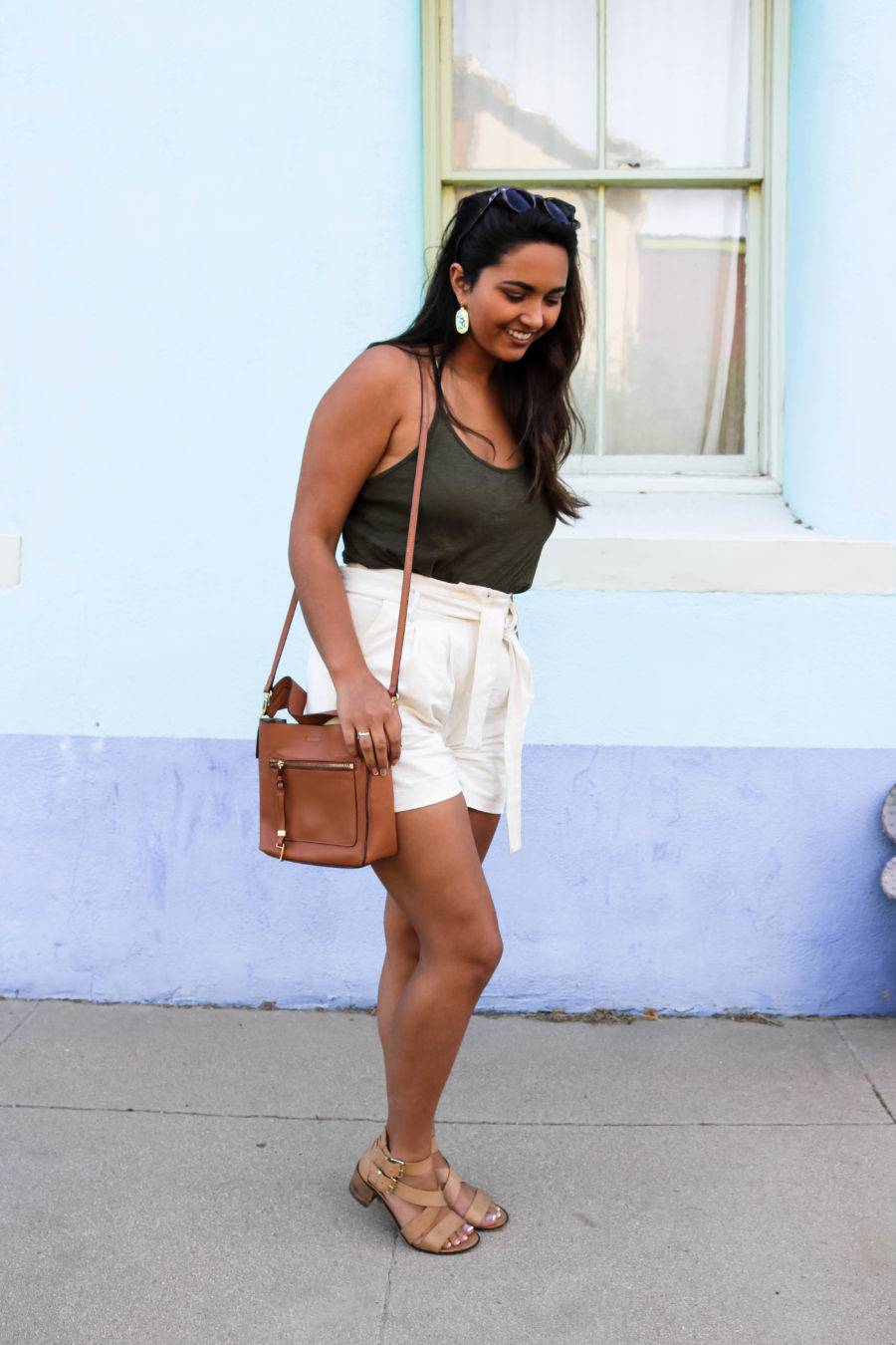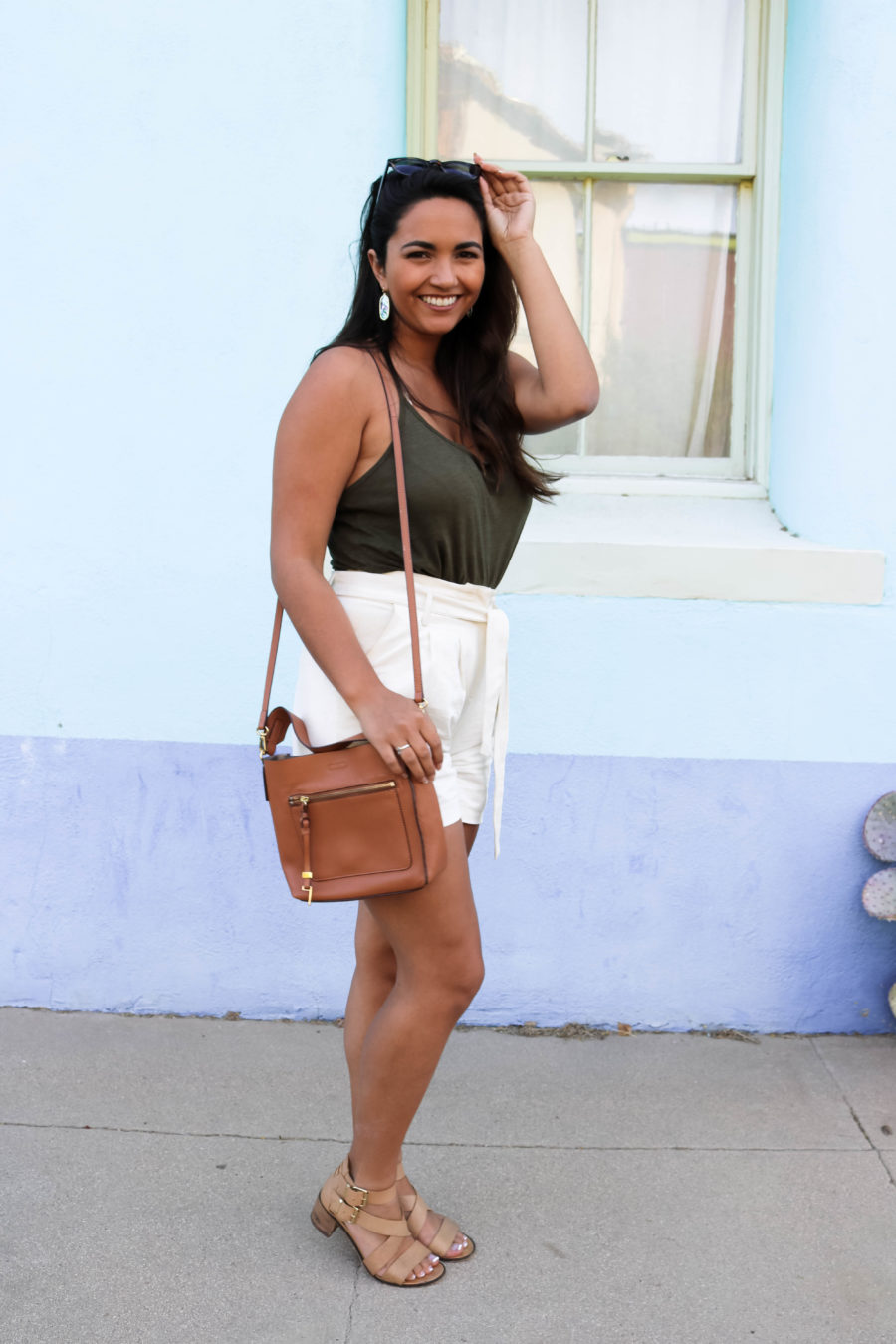 Now, for this fair outfit, I wore white shorts and a green tank top. Olive green is one of my favorite summer colors; it looks so cute with these cream colored shorts! I accessorized with these beautiful Kendra Scott Abalone Earrings that came in this month’s Rocksbox (try a month free with the code KIRSTENORTEZXOXO) and this versatile Cate Riley crossbody. This crossbody is one of my new faves because the saddle brown is perfect for summer and it is the perfect size for summer events (like fairs and concerts!). I even brought this crossbody on spring break with me because it seamlessly matched almost every outfit. It’s so well made too!