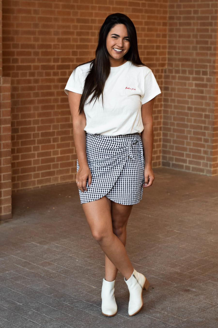 For my day-to-day look, I really saved the best for last here. I paired an embroidered tee with on-trend white booties and, of course, the skirt for a look that’s easy to wear and perfect for summer and fall. I don’t doubt that I will be wearing this look well into the school year.