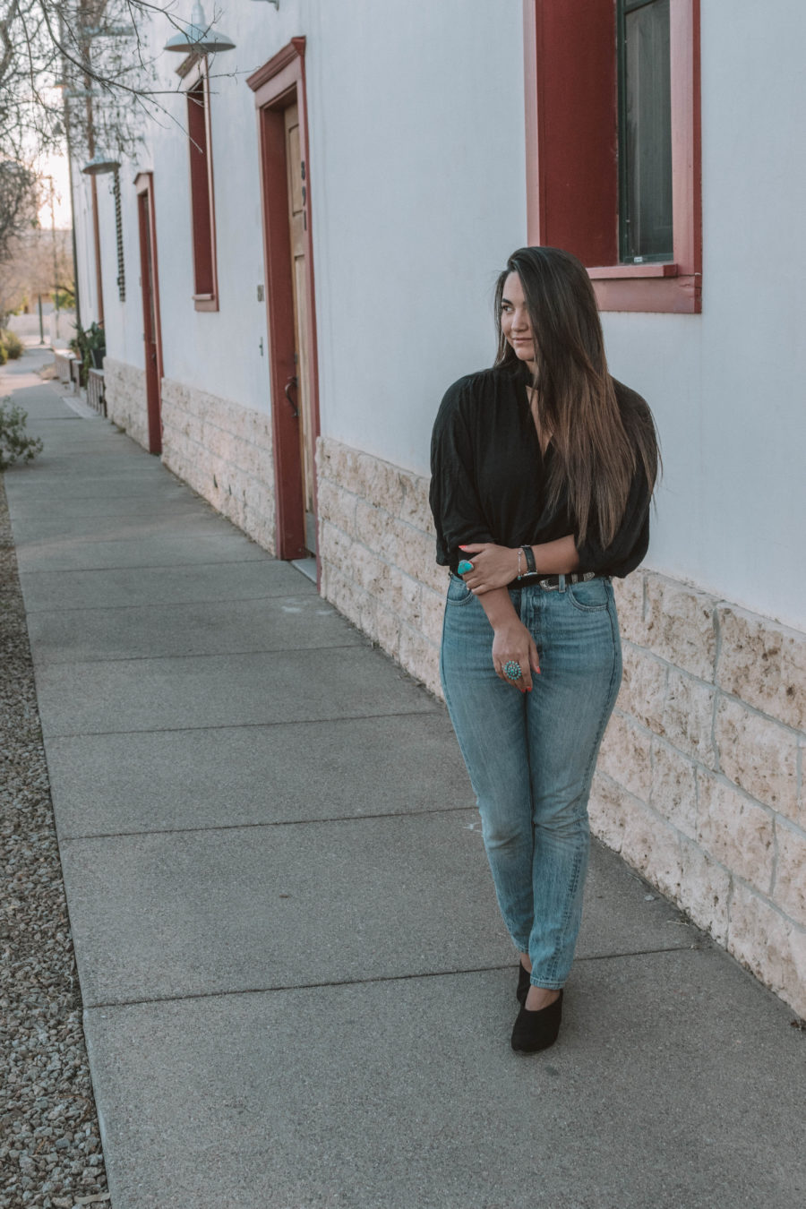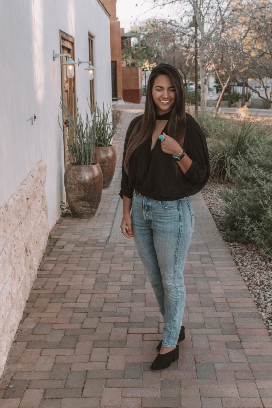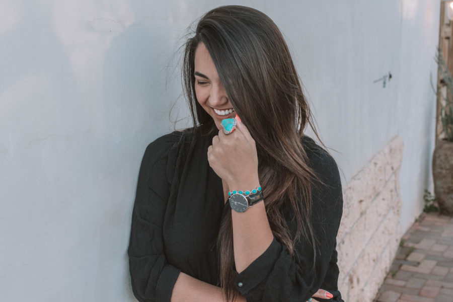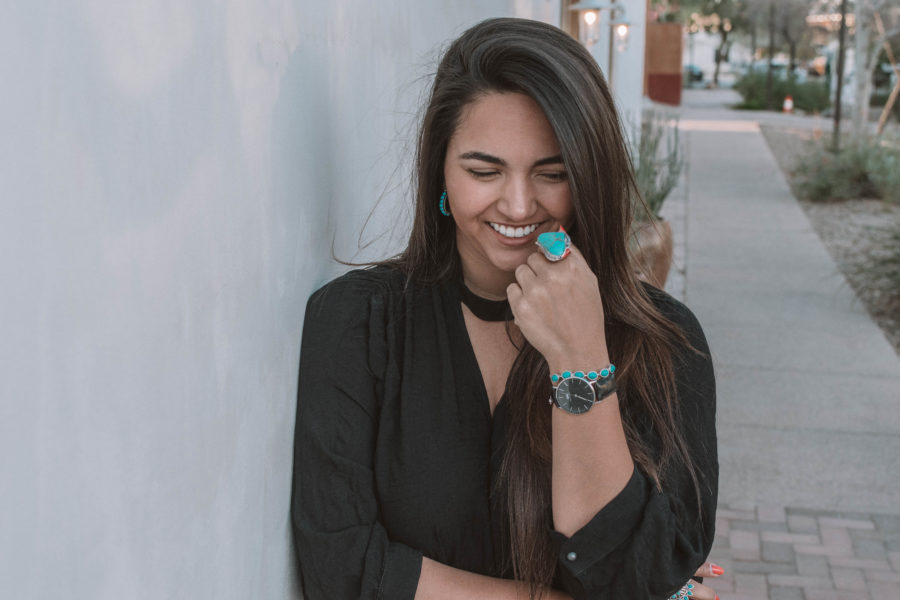 Although you can style turquoise with anything, I love how it stands out with my vintage wash jeans and a black blouse. The Southwestern inspiration in the pieces also matched perfectly to my belt to give this look a little Arizona flair. I tend to prefer that my turquoise pieces fall more in the range of blue tones, rather than green tones, and my favorite ring (pictured below) even has a little speck of coral to compliment the blue.