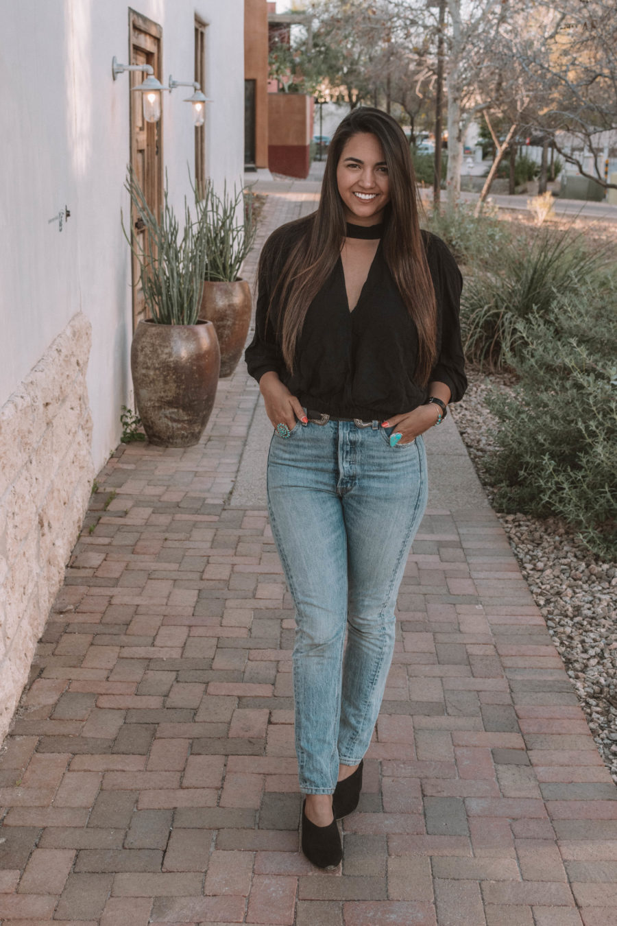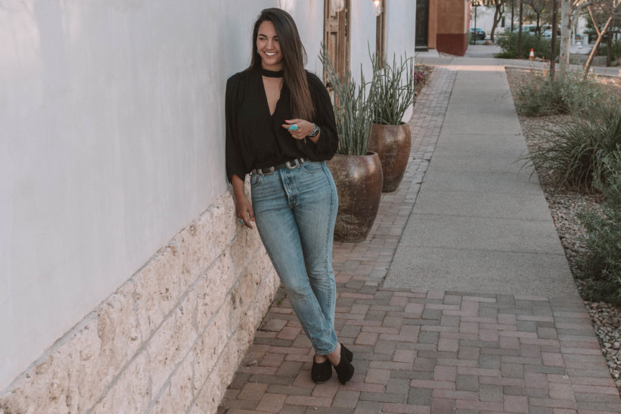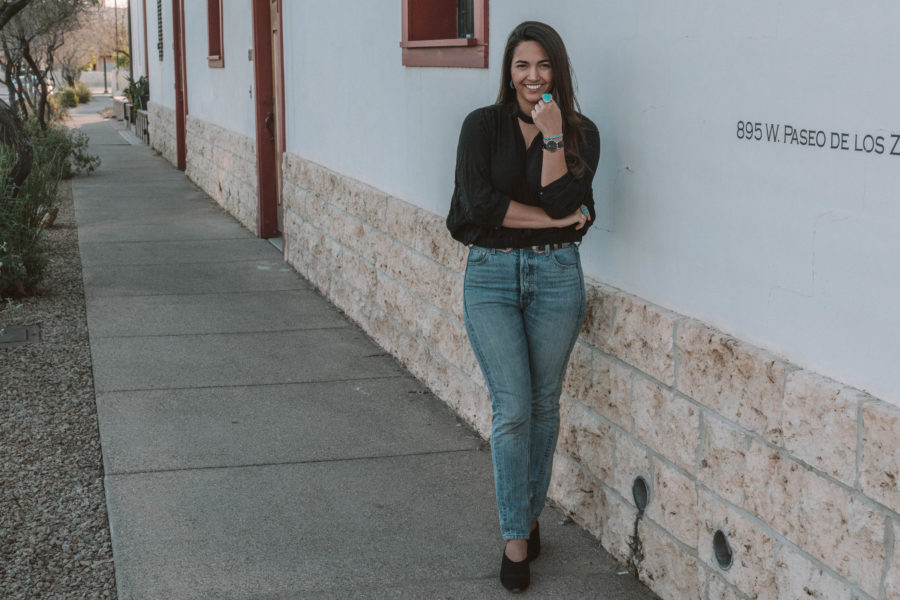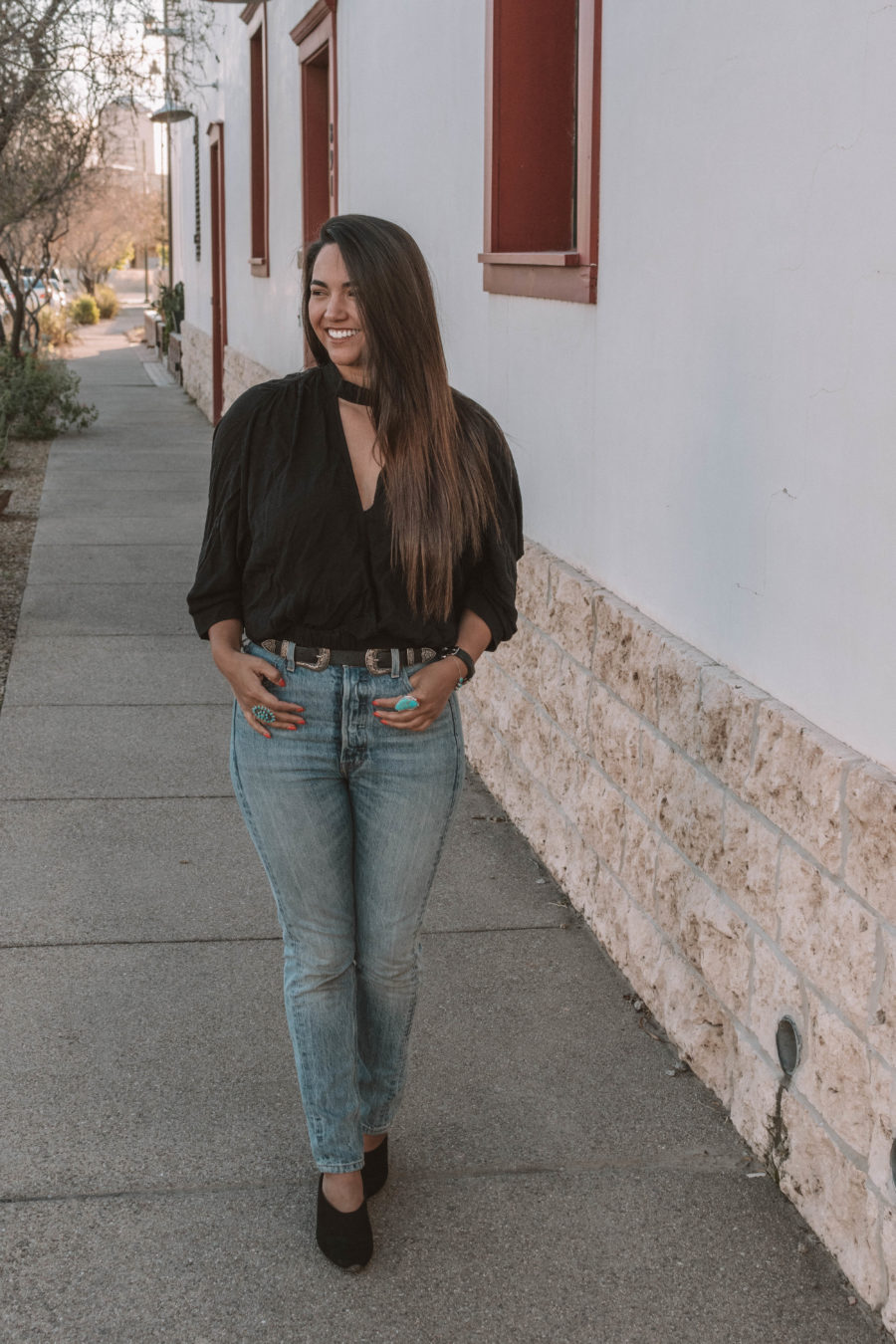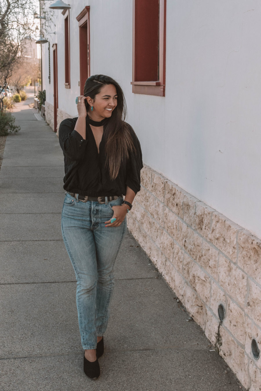 Although you can style turquoise with anything, I love how it stands out with my vintage wash jeans and a black blouse. The Southwestern inspiration in the pieces also matched perfectly to my belt to give this look a little Arizona flair. I tend to prefer that my turquoise pieces fall more in the range of blue tones, rather than green tones, and my favorite ring (pictured below) even has a little speck of coral to compliment the blue.
