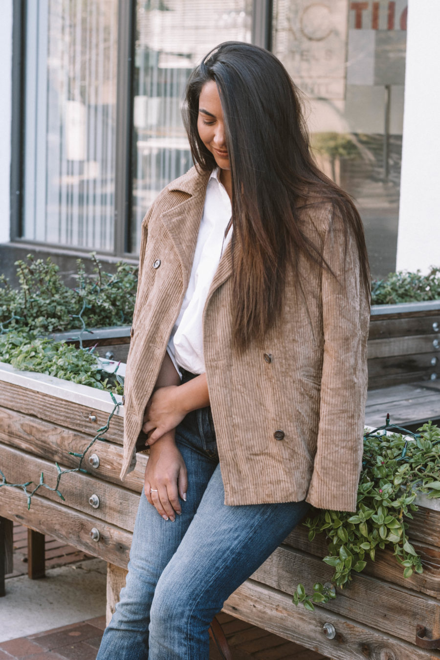 I recently stumbled upon Swap.com when I got a free $20 gift card (by the way, they send out these credits a lot)! At first, I just bought a few sweaters and a pair of vintage Calvin Klein Jeans. Recently, I picked up a gray wrap top, a corduroy jacket (the one I’m wearing below), a denim vest for summer, and another silk button down.