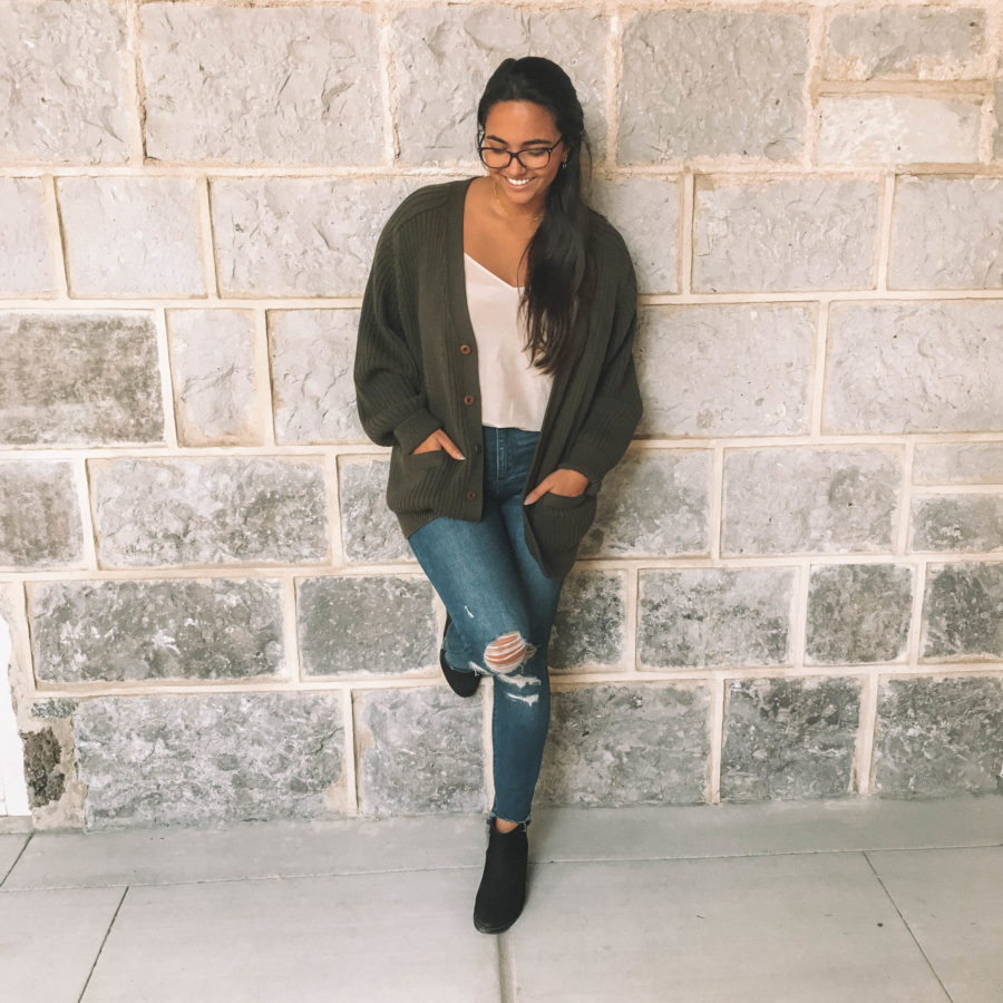 Cardigan: Goodshop Badshop // Top: Lilly Pulitzer // Jeans: Abercrombie // Booties: Nordstrom // Necklace: Mejuri // Earrings: Mejuri