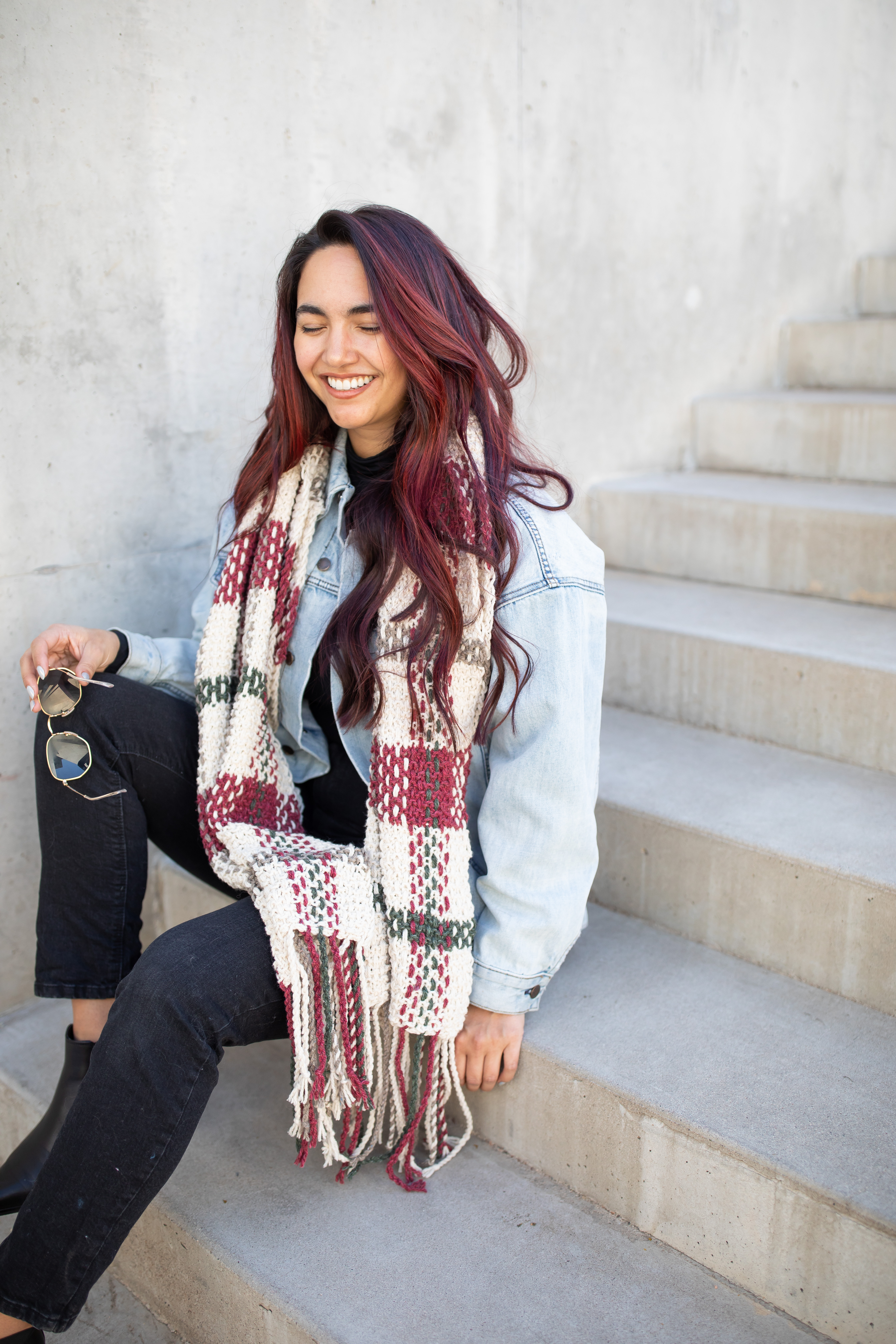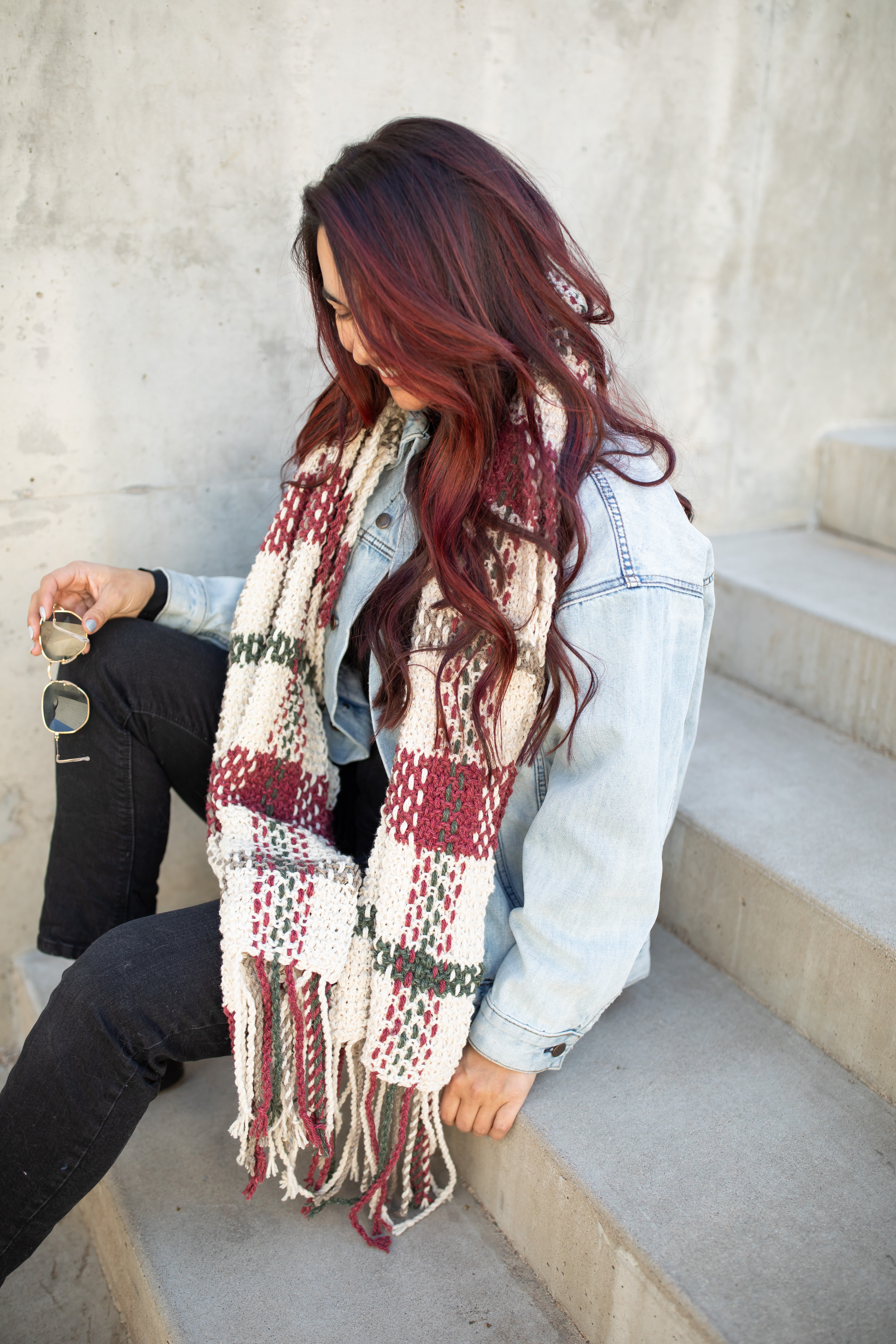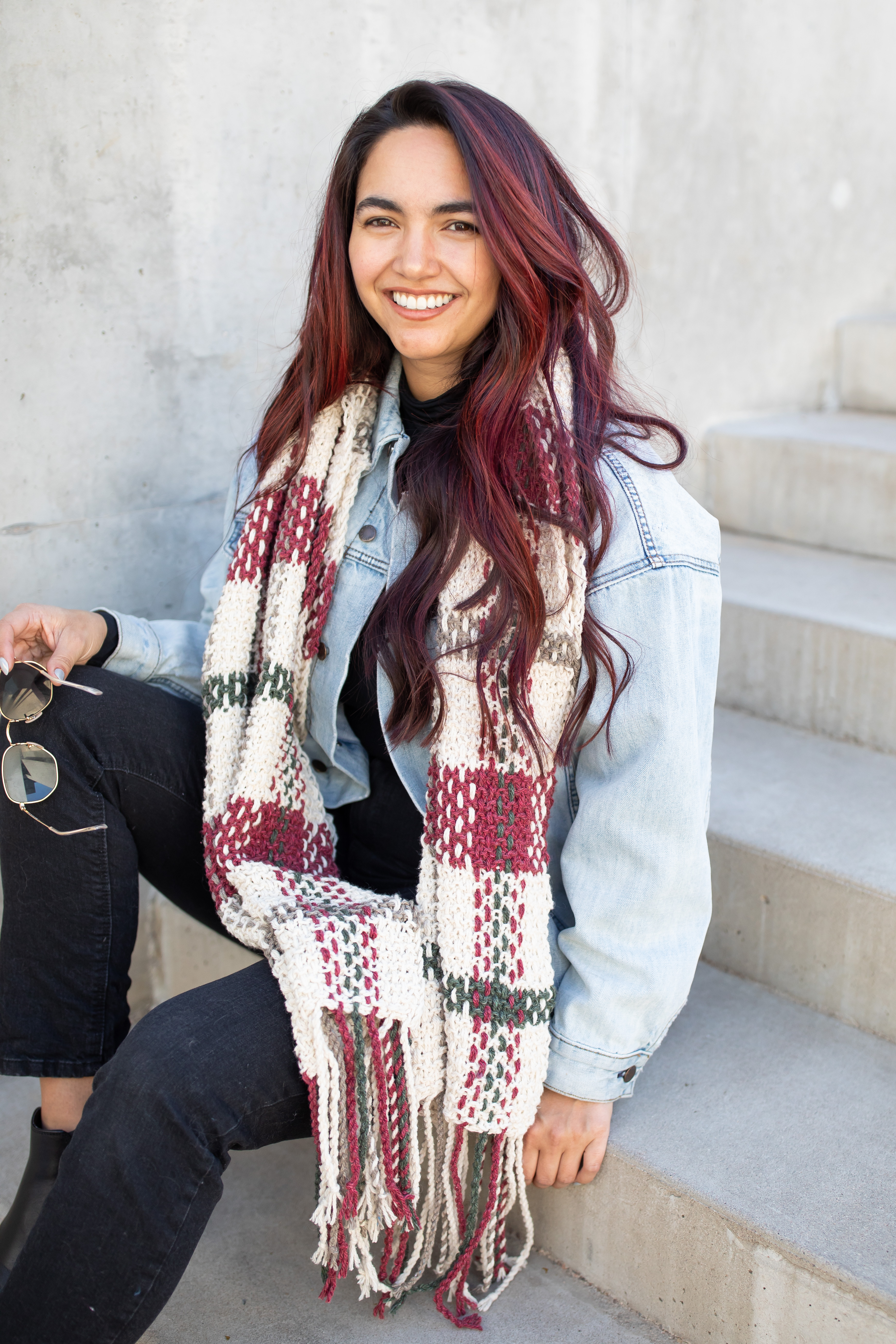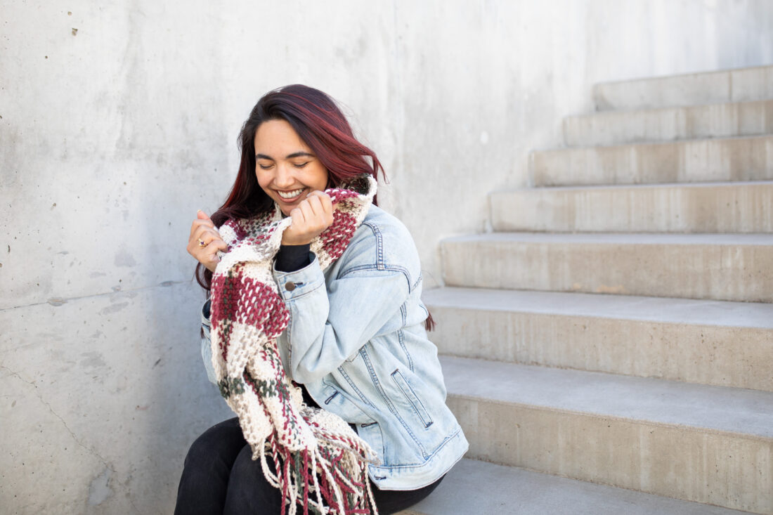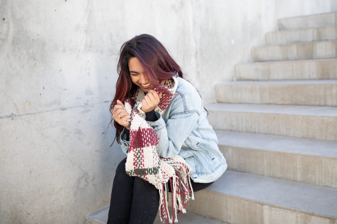 Once the base is complete, there’s a bit more work to do: weaving long strands vertically into the knitted base to create the plaid effect. The fringe is a twisted rope fringe at each end, making it easy, but still adding the perfect finishing touch.
