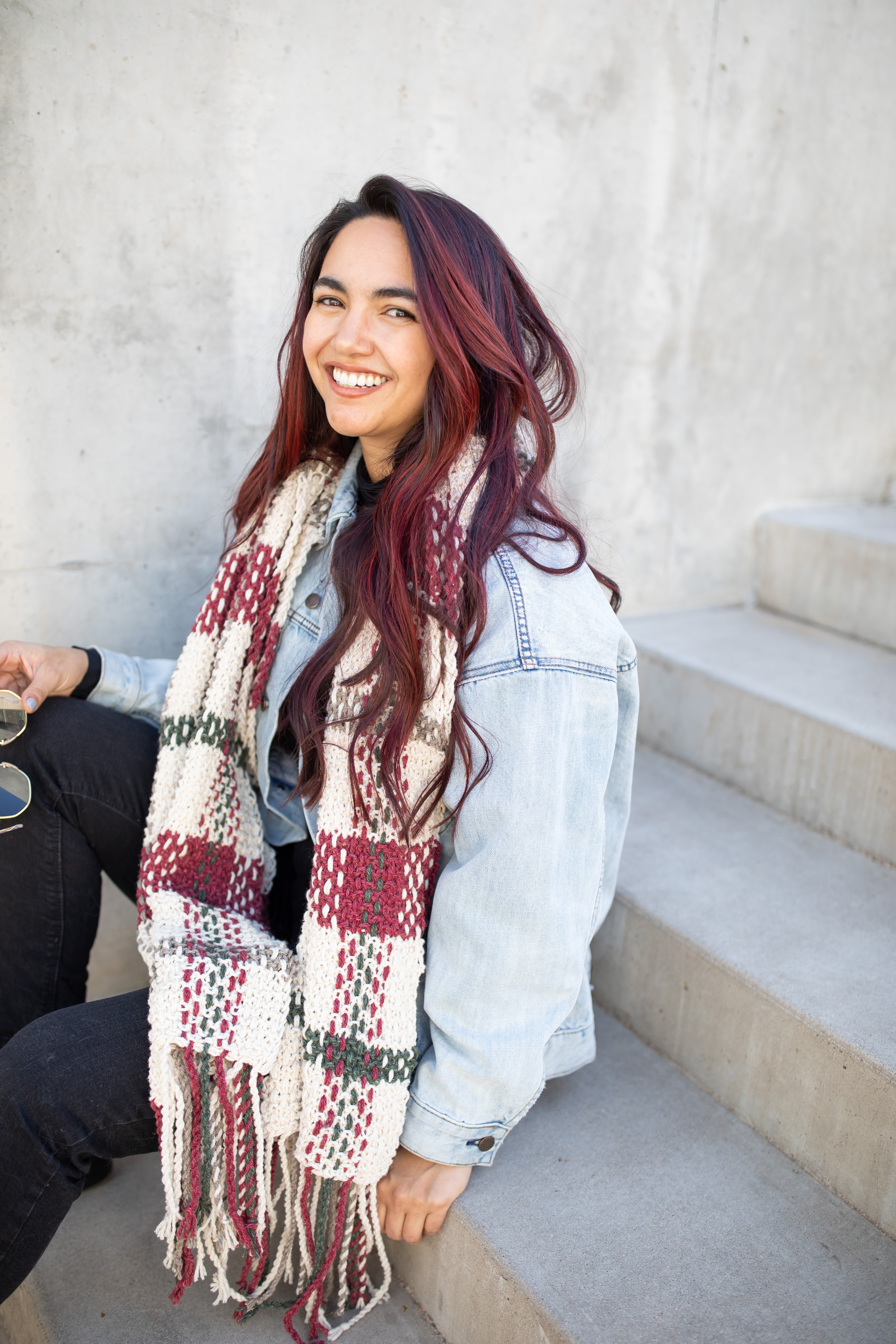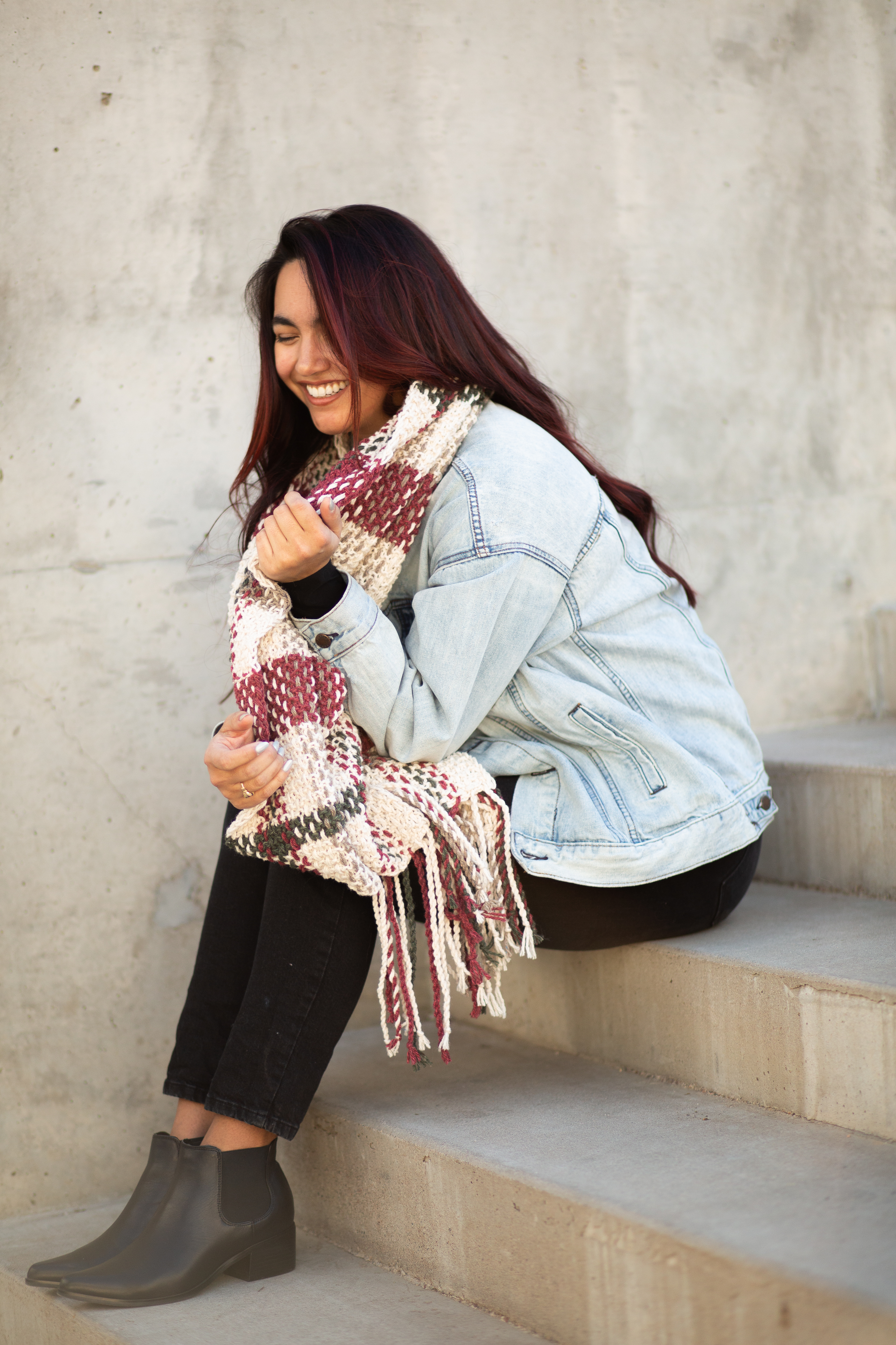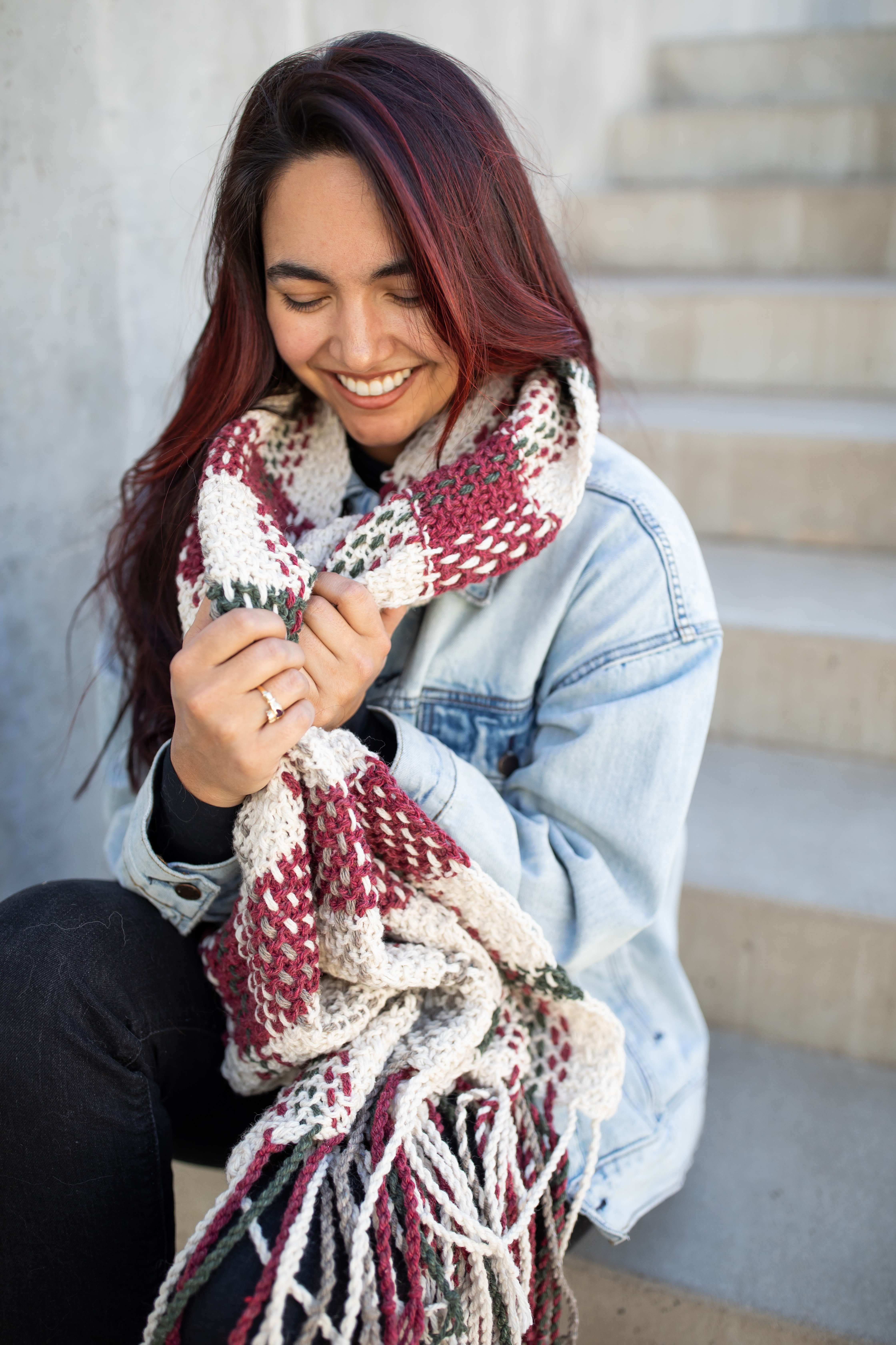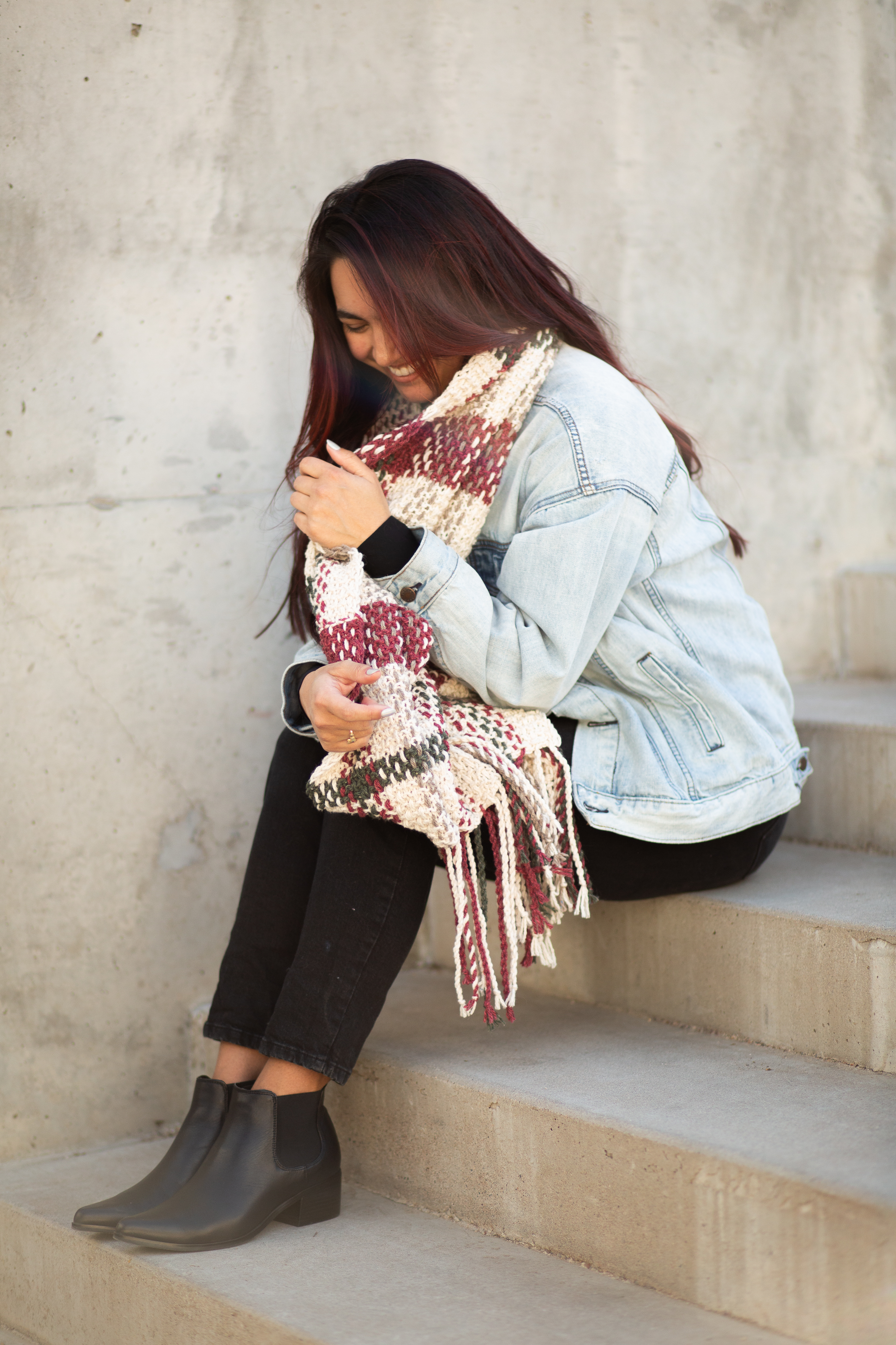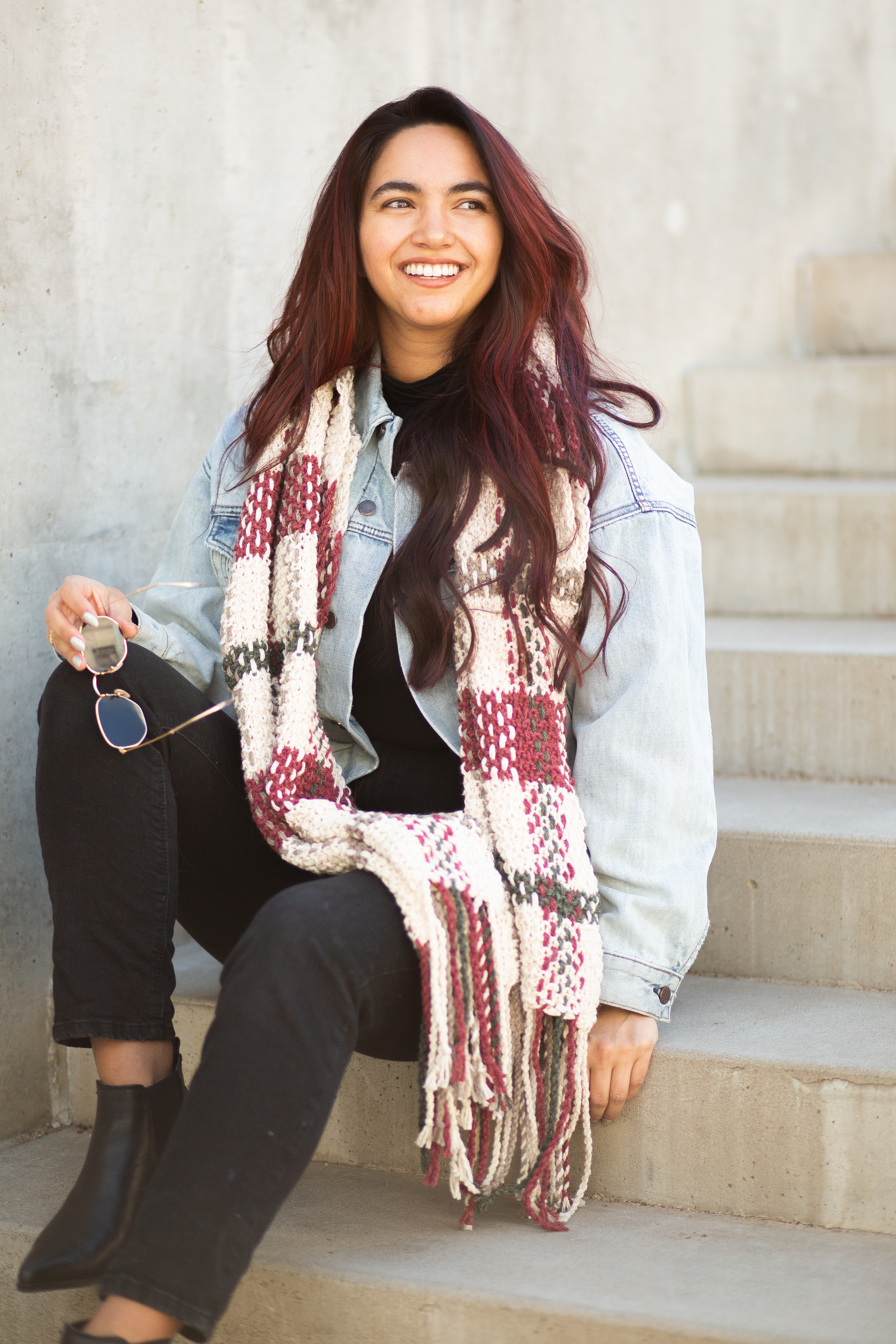 Once the base is complete, there’s a bit more work to do: weaving long strands vertically into the knitted base to create the plaid effect. The fringe is a twisted rope fringe at each end, making it easy, but still adding the perfect finishing touch.
