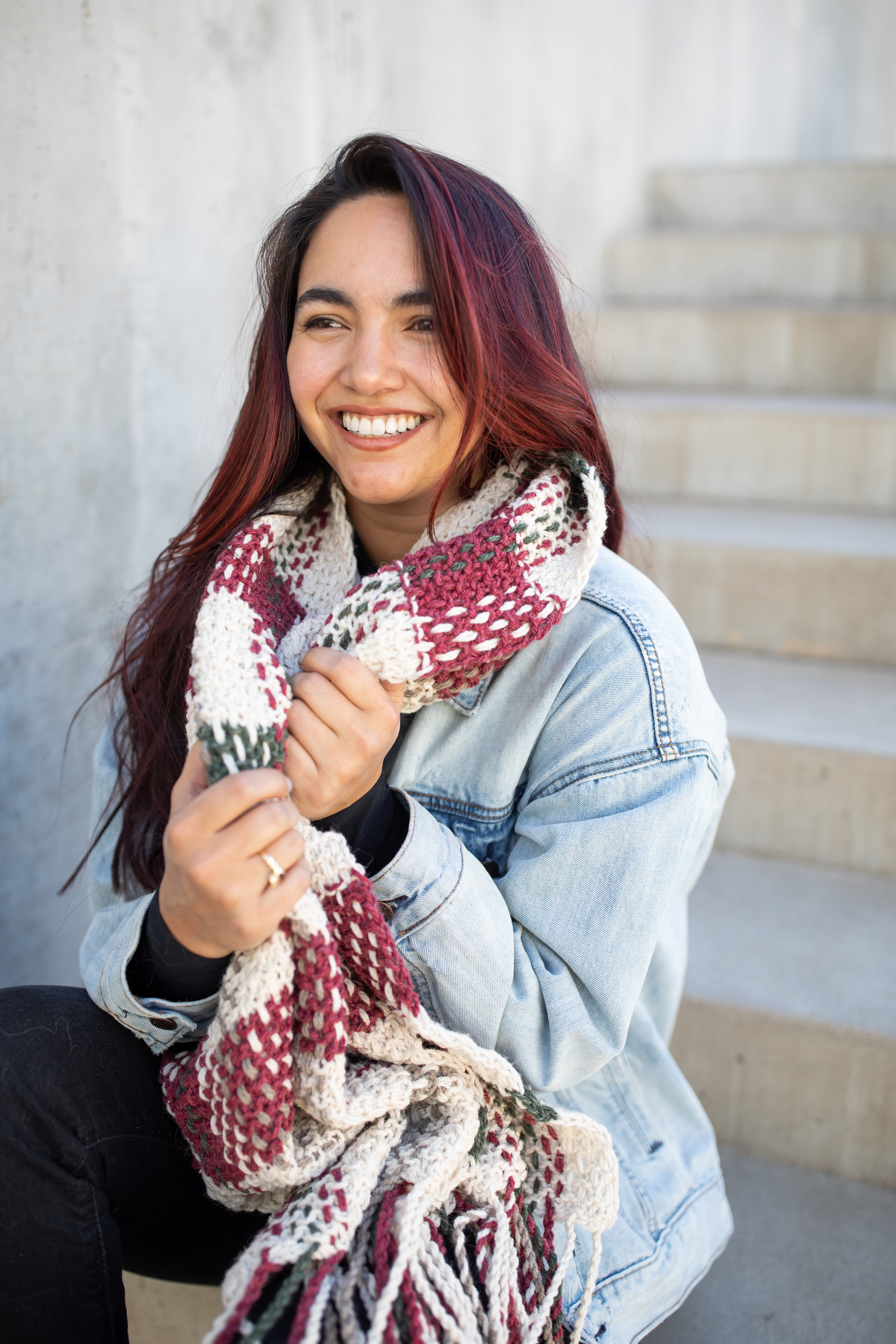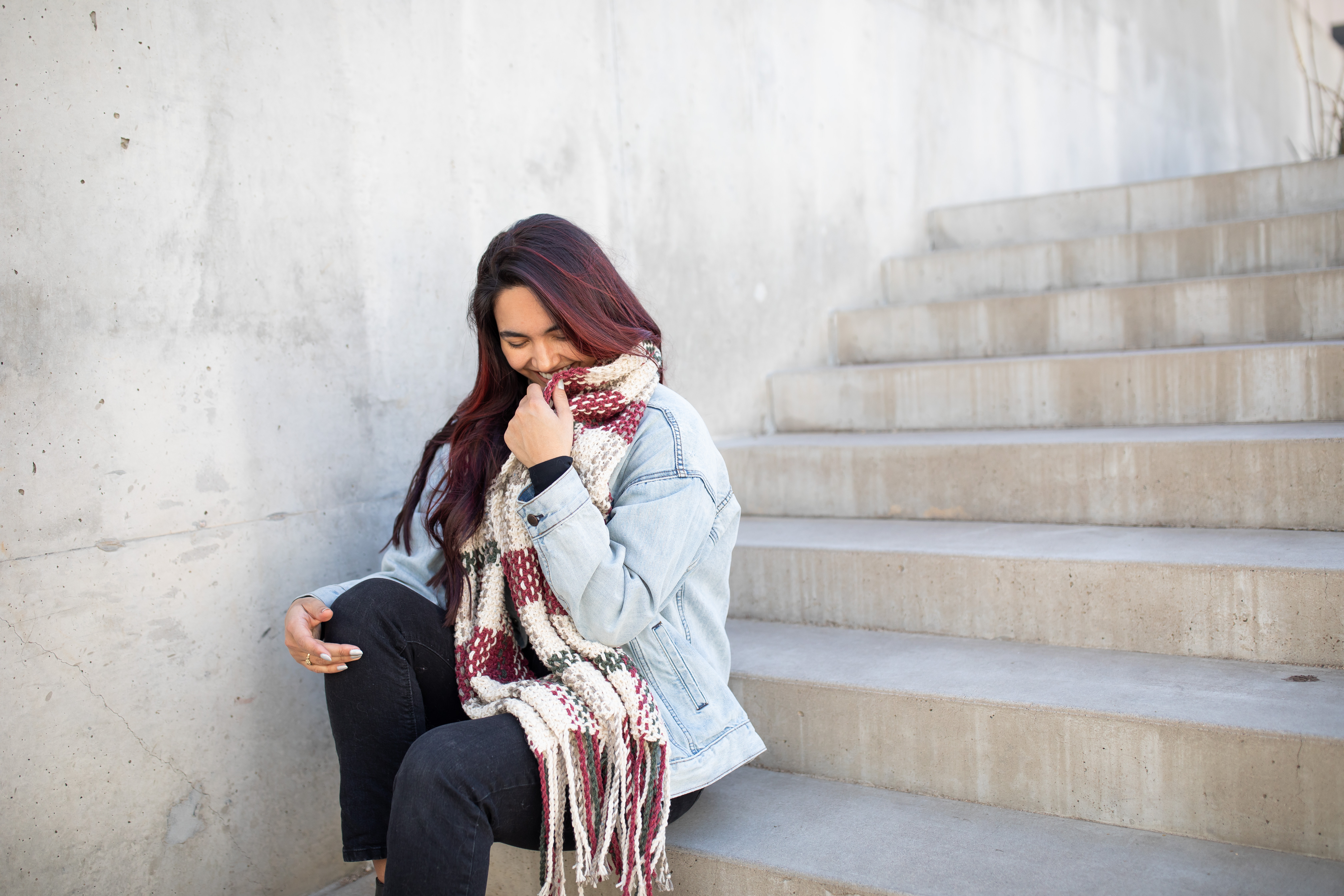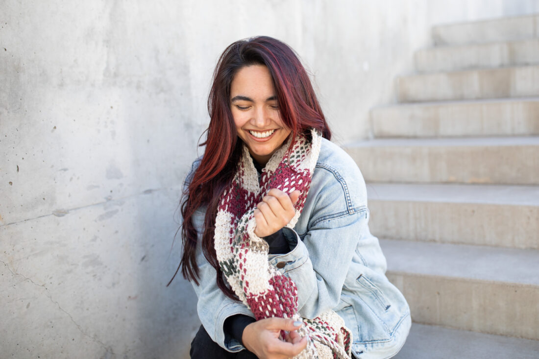 Want something shorter/thicker for a more cosy wrap? Adjust your cast-on stitch count or use a chunkier needle and try knitting with a slightly chunkier yarn! Personally, I added 4 additional rows to each red section for larger color sections and a bit of overall length to my scarf.