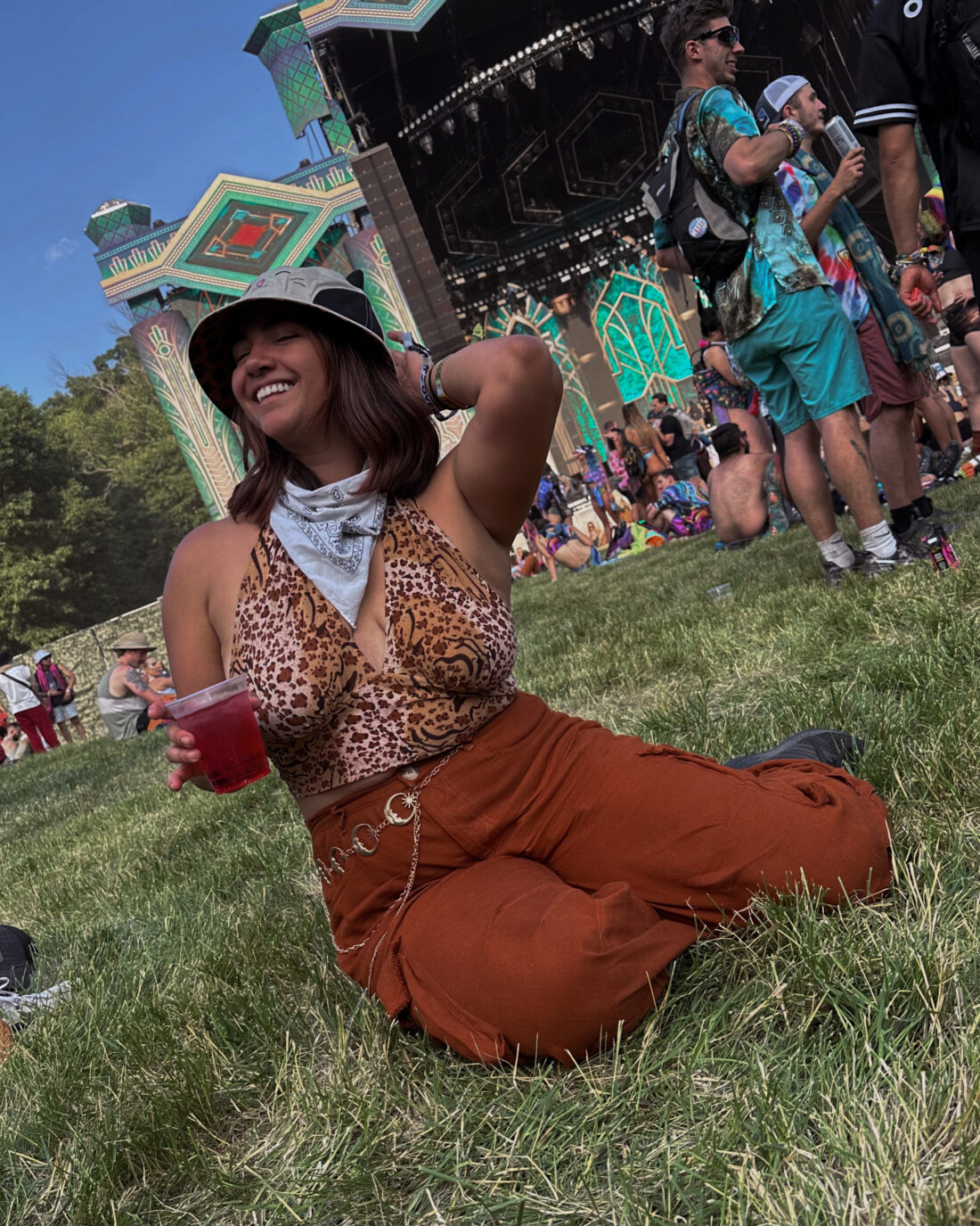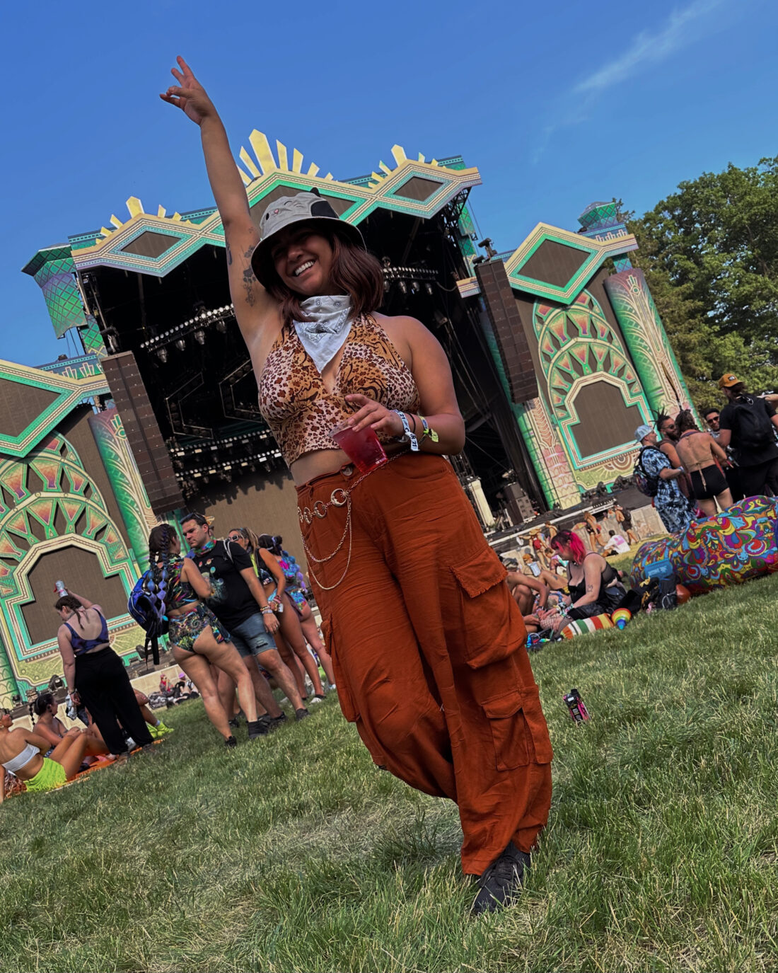 My day 1 outfit might have been my favorite; I didn’t even put this together until after I arrived. The pants were thrifted from Uptown Cheapskate in Gilbert and the halter top was thrifted from thredUP, but both items are Urban Outfitters brand. I paired it with a chain belt that my friend had ordered for Taylor Swift, but gave to me since it matched a lot of my outfits. I borrowed the Squishmallow bucket hat from a friend and finally added a little bandana to finish the look. Bandanas are a must for hot summer festivals; you can get them wet to help cool you down or you can use it as a mask if it gets dusty.
