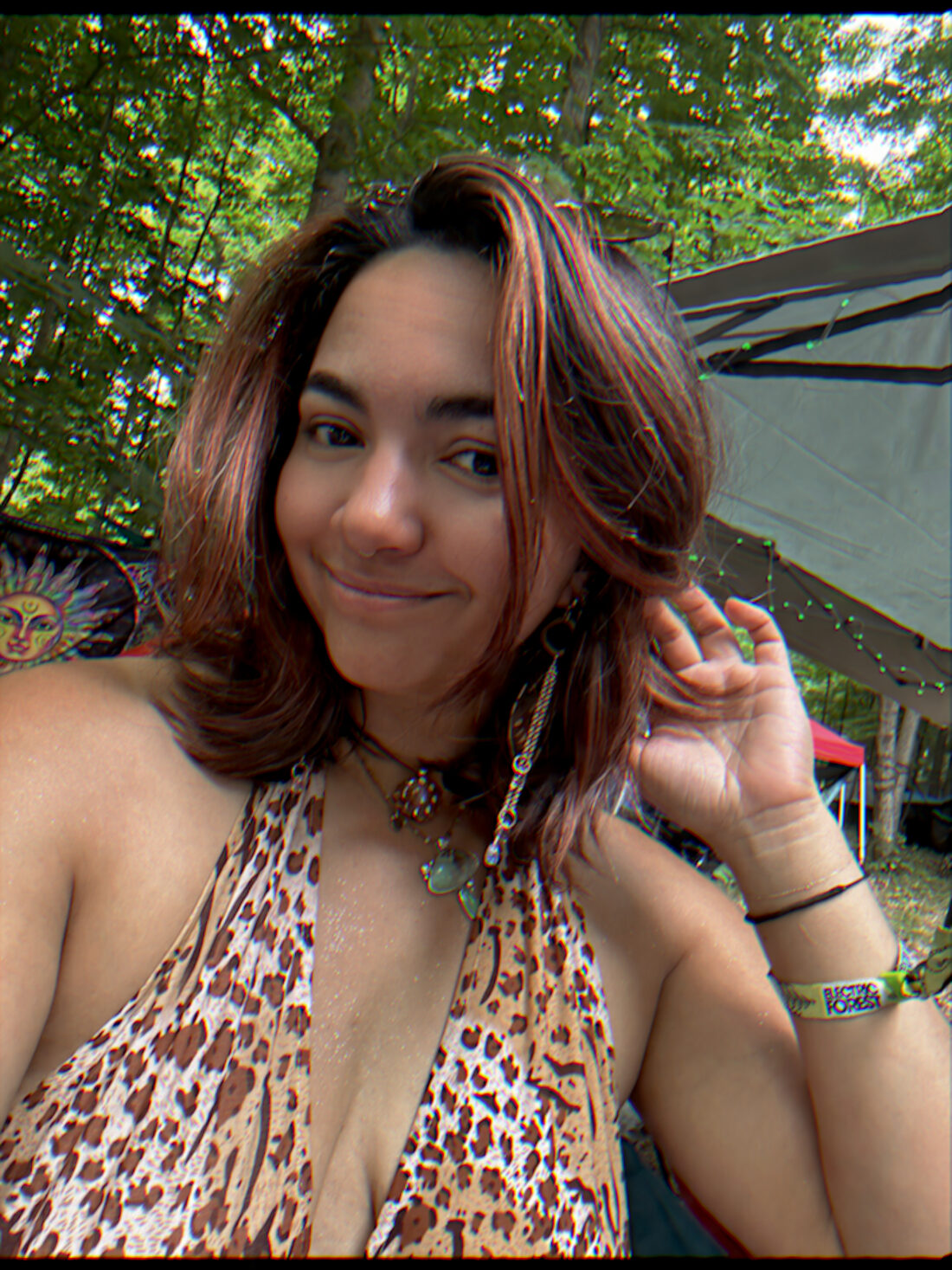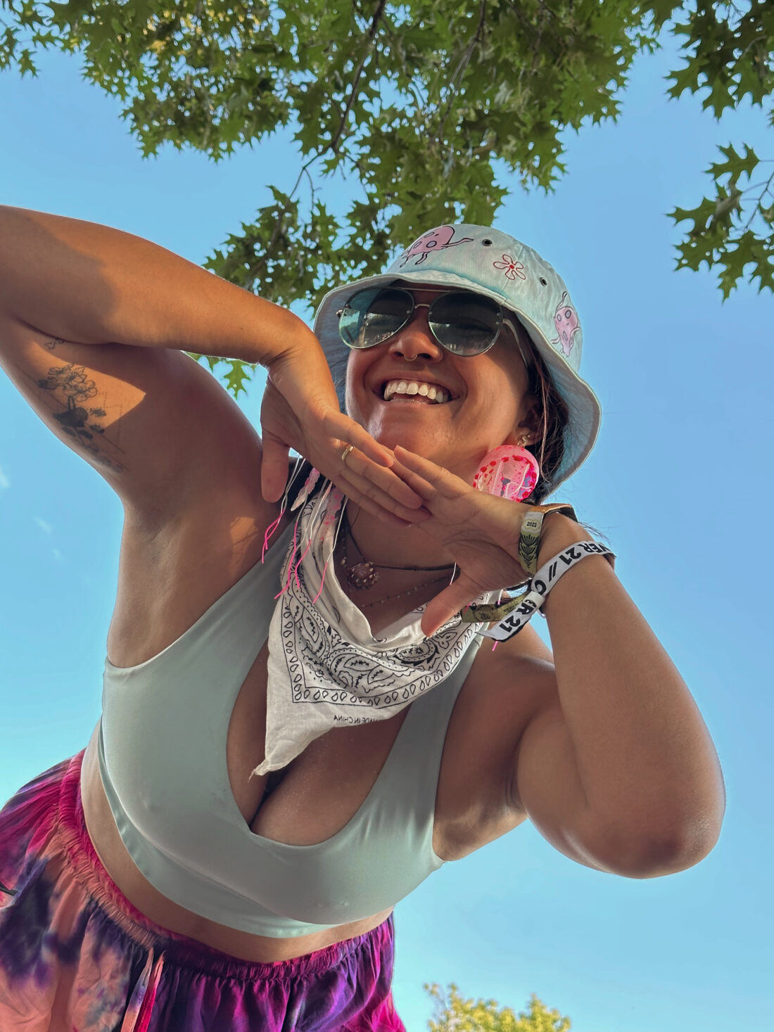 I almost always wear my Adidas Ultraboosts for music festivals now; they seem to hold up the best for all-day wear with a lot of steps. Even though you can’t fully see them in the photos, I also wore a necklace I made myself, a third eye pinecone necklace, and a pair of fairy wing earrings that I found on Etsy.