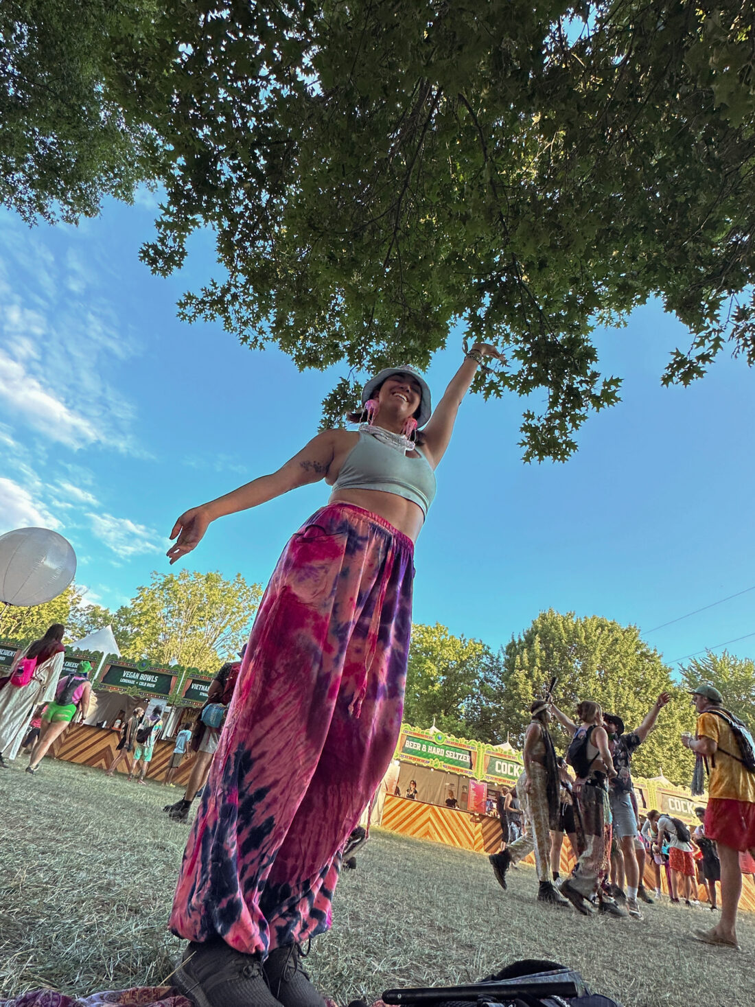 The top was just a sports bra I had on hand, which was super easy to wear all day. I found these pants at the festival and bought them because I loved the color so much.