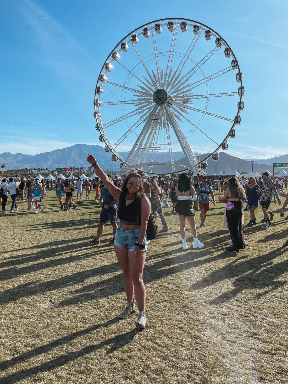 One thing that you will always see at Coachella is crochet or knitwear of some kind. It’s truly my goal to eventually knit or crochet my own top to wear to this festival, but my ADHD has kept me from that so far. I always start projects to not quite finish in time. But – these Farm Rio shorts are perfect if you want to skip that crafty bit but still fit into the artsy aesthetic. And the knee high Dr. Martens? One of my favorite concert items! They can get a little warm so I’d recommend them on a day where you plan on going in later since it does cool down at night.