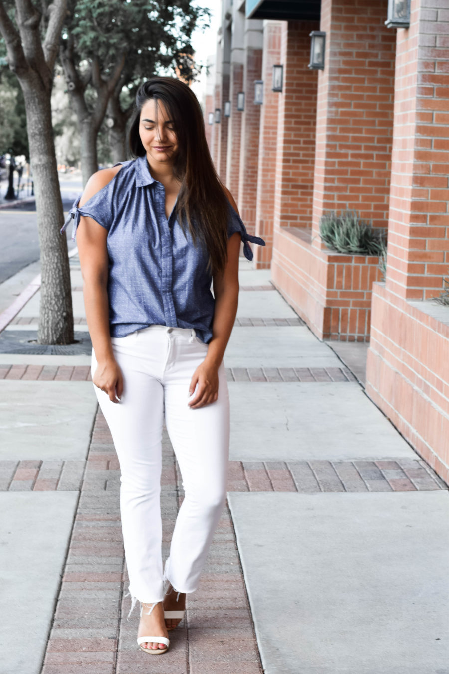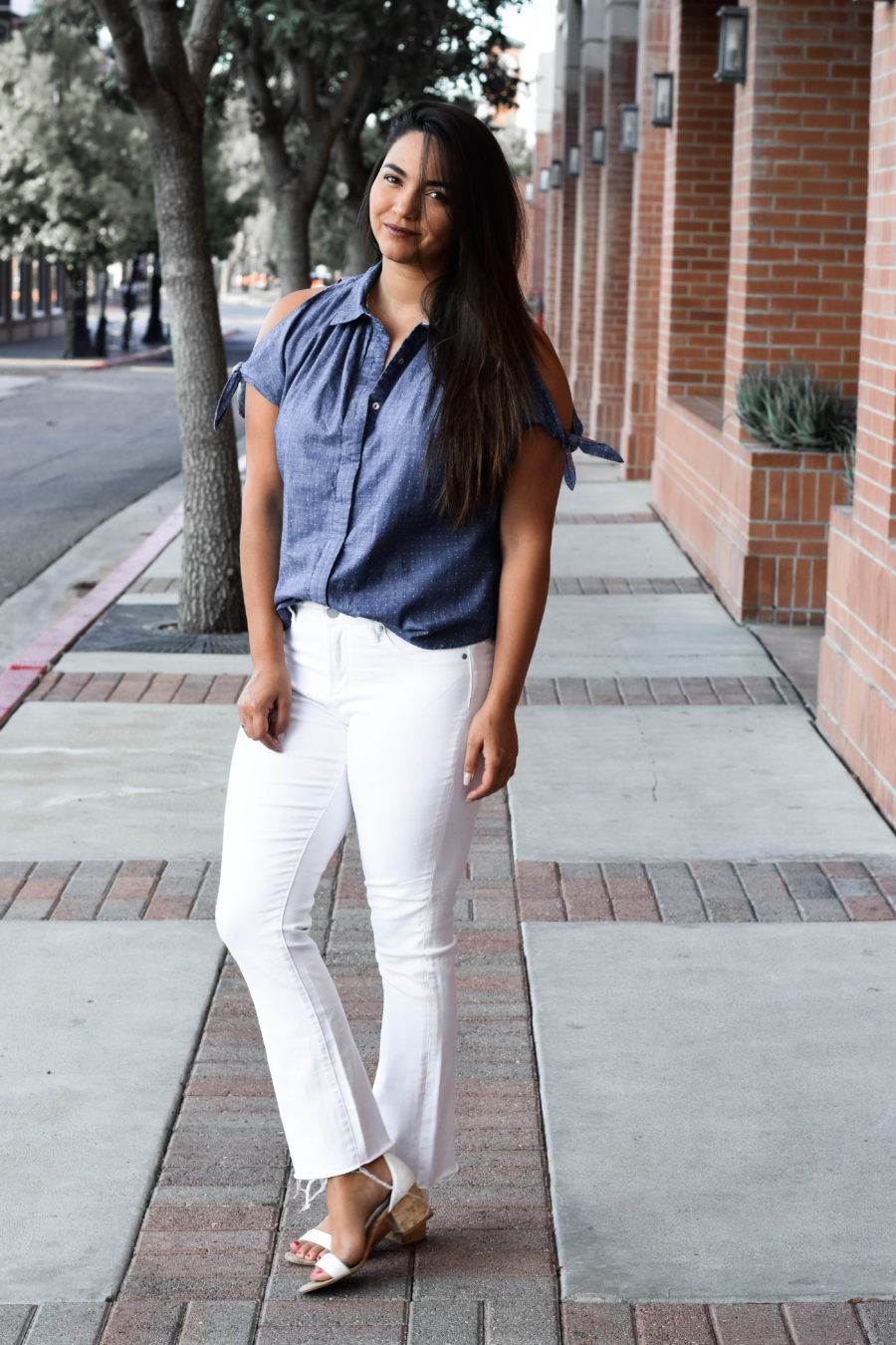 This look was one of the simplest looks, but I loved how the denim shirt looked with the white pants. I always loving pairing denim and white together and this look was no exception. Personally, I prefer to pair my crop flares with a tiny heel – which is why I’m sporting a short block heel sandal. I wore it with a cold shoulder denim shirt to give it some last days of summer vibes without going over the top.