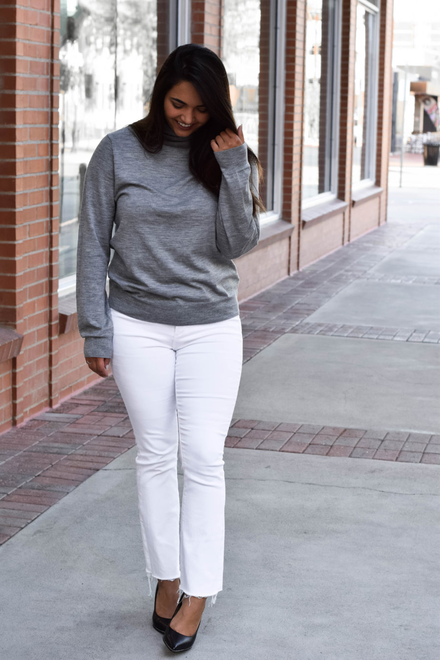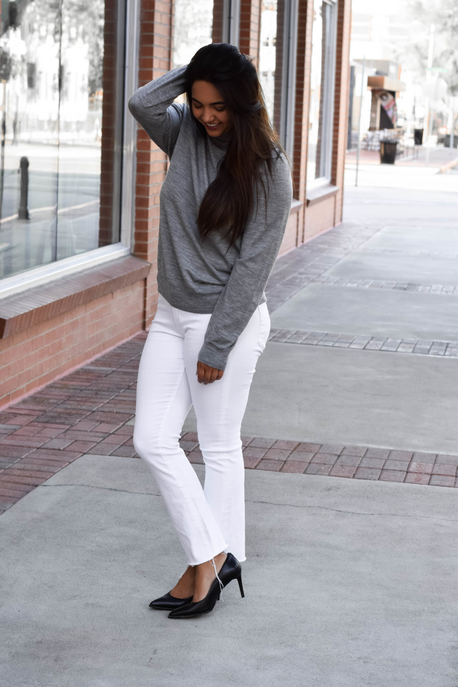 I’ll be honest with ya’ – white crop flares are hard to style. White alone is hard to style with pants. When they also have a unique shape like crop flares, it gets even tougher. These crop flares from Maude Boutique are a little longer than my other pair of crop flares and didn’t have a high waist, which I wasn’t used to.