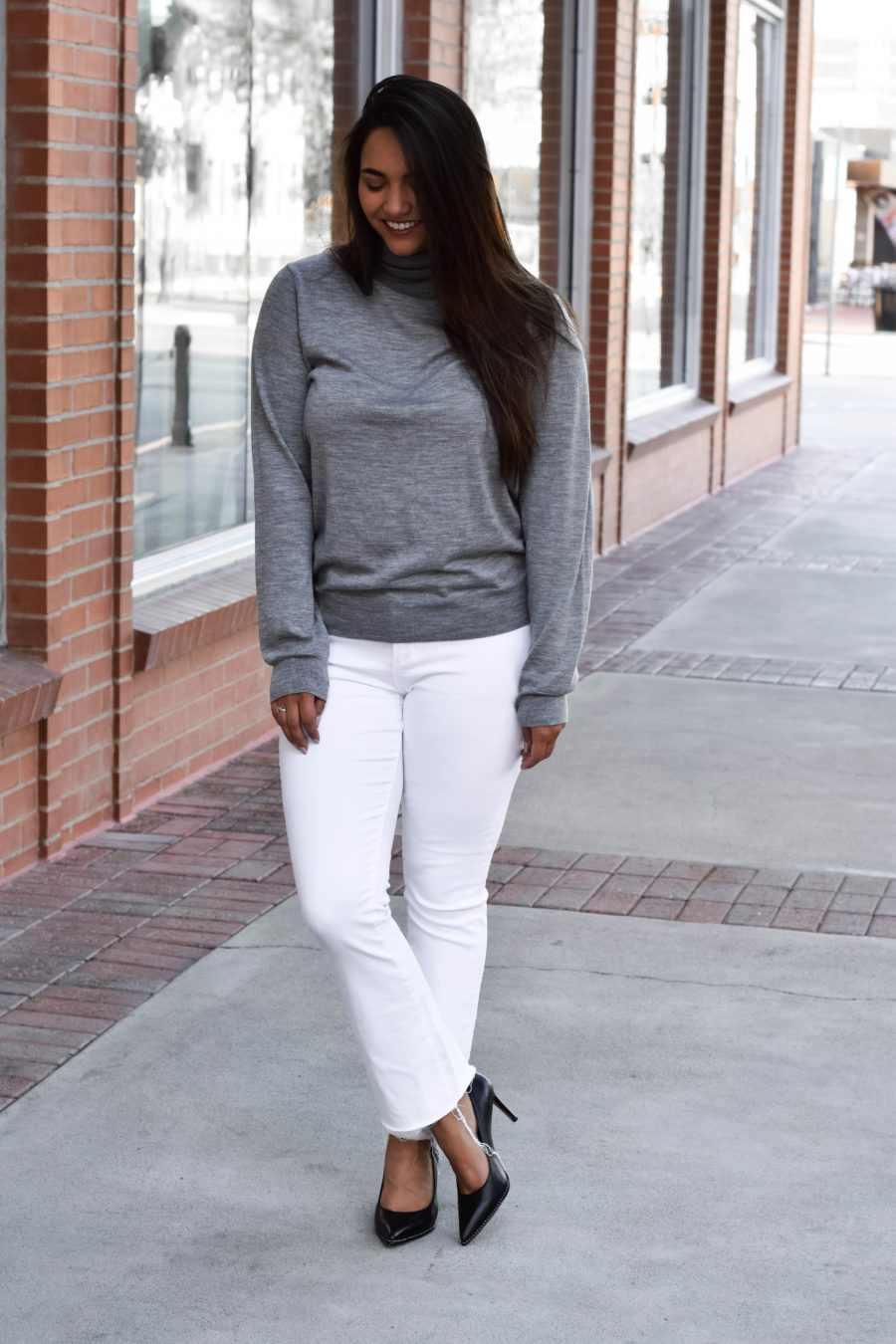 Again, a simple look, but as the weather gets colder, I love a good wool turtleneck. This one has unfortunately been devoured in places by moths but I’m hoping to replace it or get it repaired soon! Note to self: invest in mothballs. The look is overall pretty casual, so I bumped it up a notch with simple, polished black pumps. These babies are from Macy’s and are the perfect simple heel with a touch of detail to ramp up any outfit.