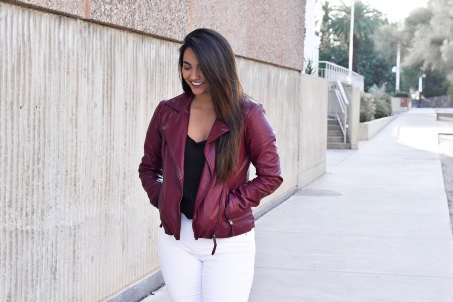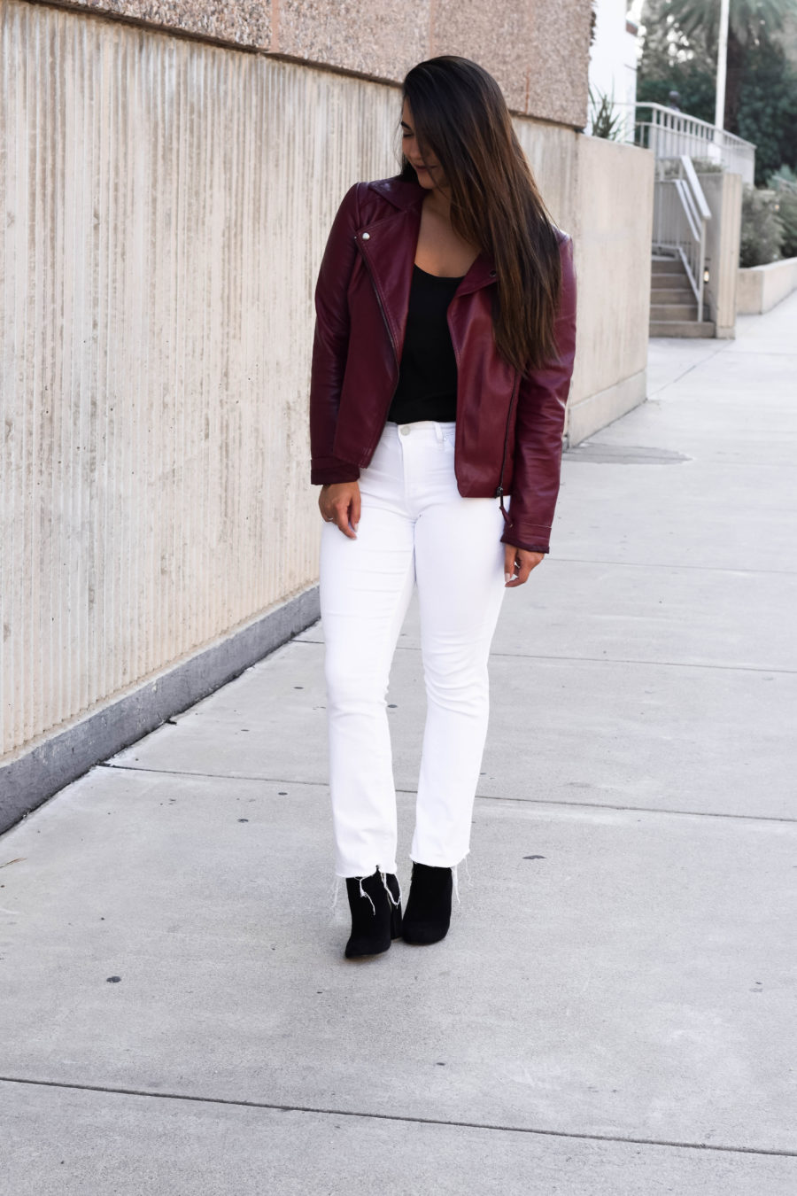 Last, my favorite look and perfect for colder fall days. I bought this red jacket years ago and it’s definitely a favorite piece of mine in my closet. Last year, I styled it with dark bottoms and a white top, so it’s only appropriate that I flipped it this year for a more unique and fashion-forward look.