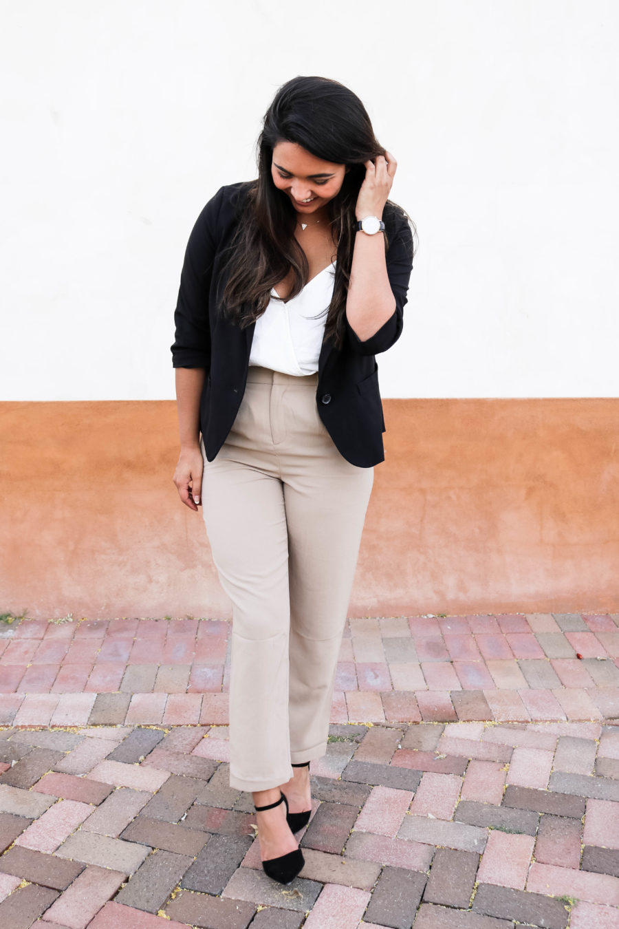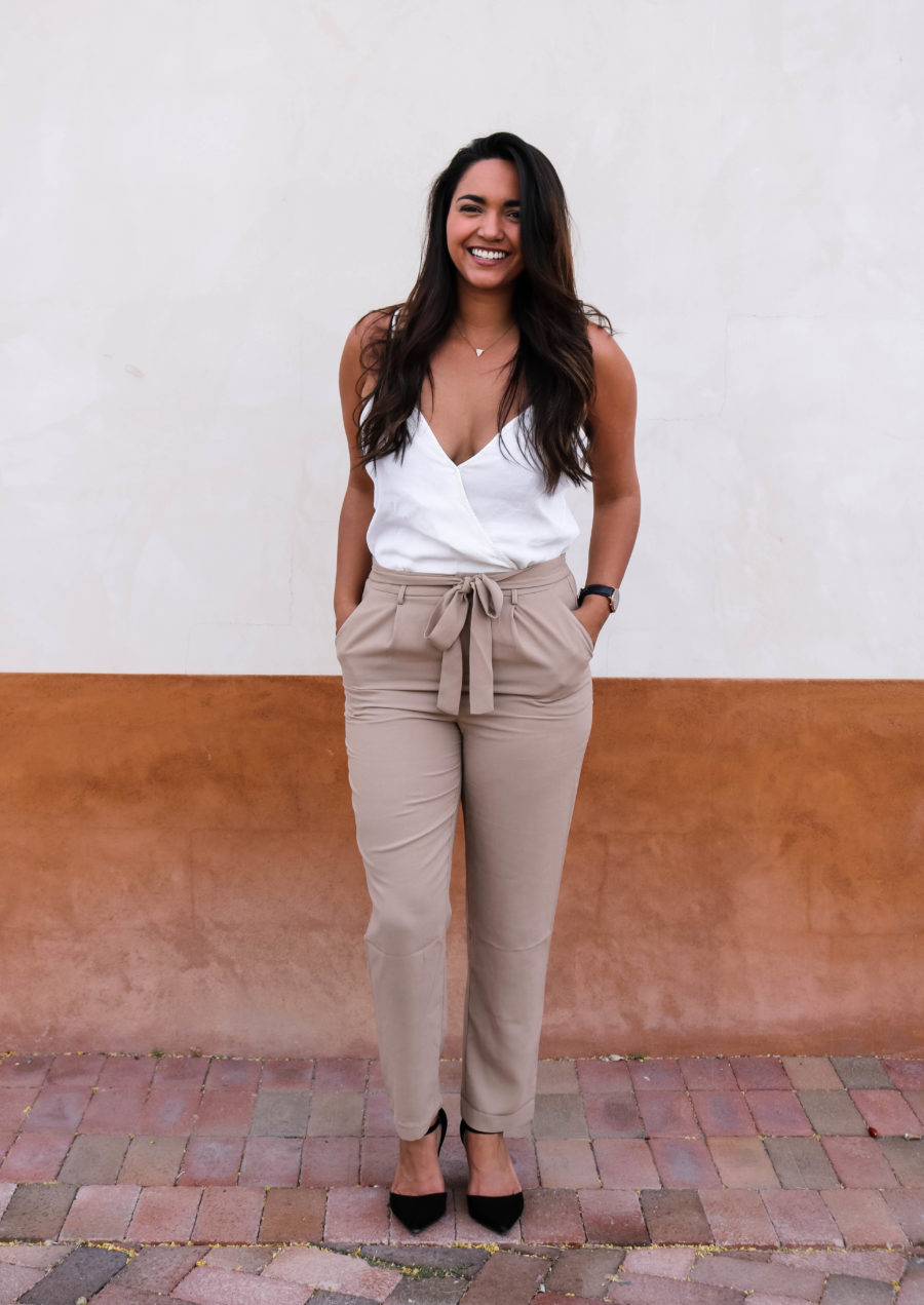 These tie waist pants from Forever 21 caught my eye for two reasons: they were 50% off and they were exactly what I was looking for. I had wanted to jump on the tie-waist-pant-trend forever, but didn’t want to break the bank to do it. I ended up buying these tie-waist pants in both tan and black and I wear them now all the time. Honestly, they kinda fit like pajama pants! When I wear the pants with a blazer, I actually tie the belt in the back, so the outfit doesn’t look to busy in the front. I think it works.